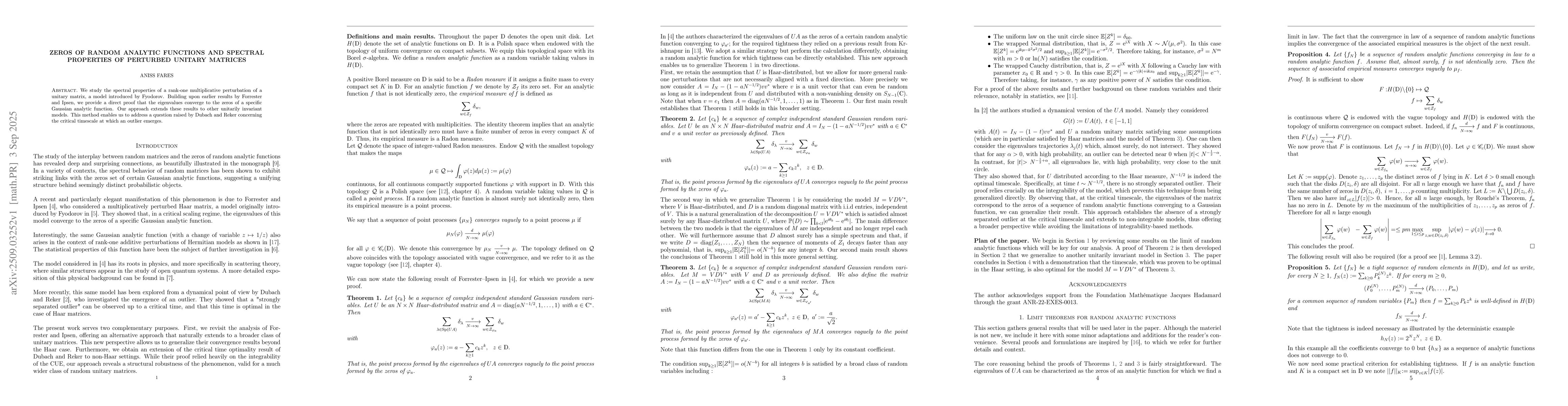 We study the spectral properties of a rank-one multiplicative perturbation of a unitary matrix, a model introduced by Fyodorov. Building upon earlier results by Forrester and Ipsen, we provide a direct proof that the eigenvalues converge to the zeros of a specific Gaussian analytic function. Our approach extends these results to other unitarily invariant models. This method enables us to address a question raised by Dubach and Reker concerning the critical timescale at which an outlier emerges.