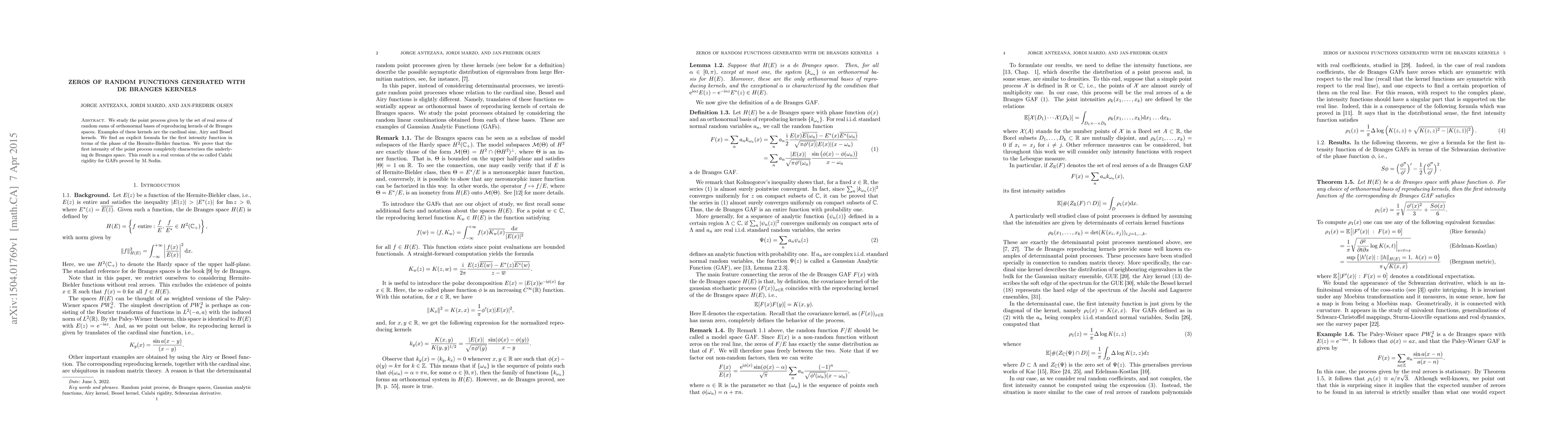 This paper investigates the zeros of random functions formed from orthonormal bases of de Branges spaces, deriving an explicit formula for the first intensity function linked to the Hermite-Biehler function's phase. It demonstrates that the first intensity characterizes the underlying de Branges space, paralleling Calabi rigidity for GAFs.