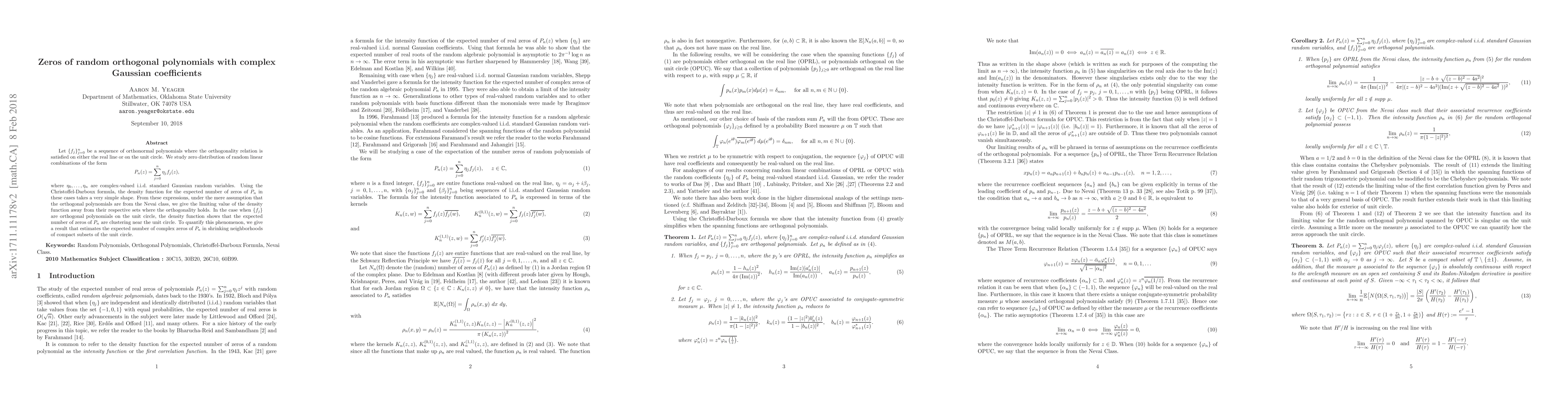 Let $\{f_j\}_{j=0}^n$ be a sequence of orthonormal polynomials where the orthogonality relation is satisfied on either the real line or on the unit circle. We study zero distribution of random linear combinations of the form $$P_n(z)=\sum_{j=0}^n\eta_jf_j(z),$$ where $\eta_0,\dots,\eta_n$ are complex-valued i.i.d.~standard Gaussian random variables. Using the Christoffel-Darboux formula, the density function for the expected number of zeros of $P_n$ in these cases takes a very simple shape. From these expressions, under the mere assumption that the orthogonal polynomials are from the Nevai class, we give the limiting value of the density function away from their respective sets where the orthogonality holds. In the case when $\{f_j\}$ are orthogonal polynomials on the unit circle, the density function shows that the expected number of zeros of $P_n$ are clustering near the unit circle. To quantify this phenomenon, we give a result that estimates the expected number of complex zeros of $P_n$ in shrinking neighborhoods of compact subsets of the unit circle.