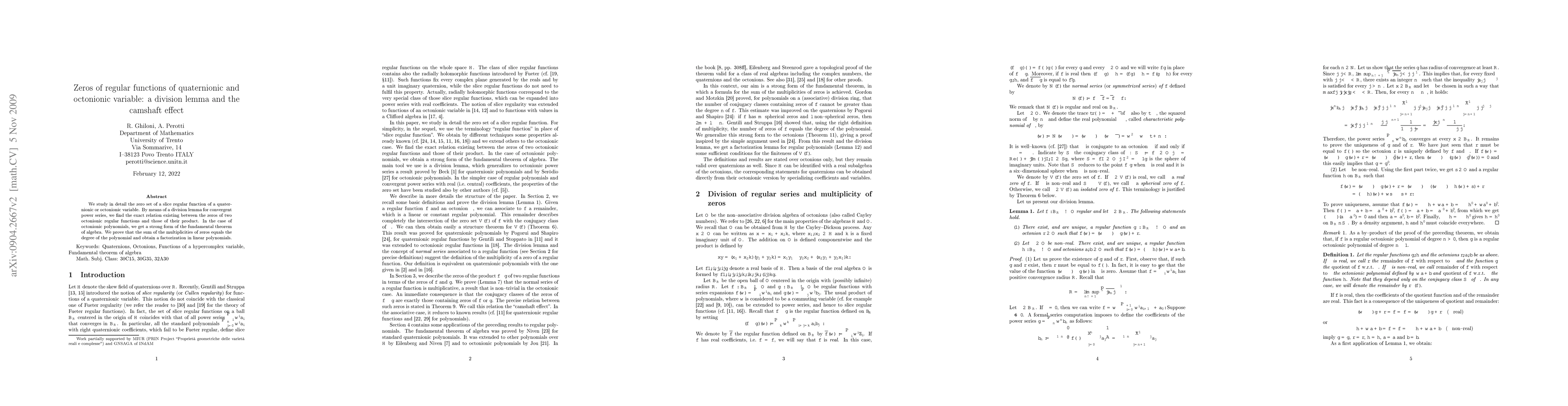 This paper investigates the zeros of regular functions of quaternionic and octonionic variables, establishing a division lemma for convergent power series. It demonstrates a strong form of the fundamental theorem of algebra for octonionic polynomials, proving that the sum of zero multiplicities equals the polynomial degree and achieving factorization into linear polynomials.