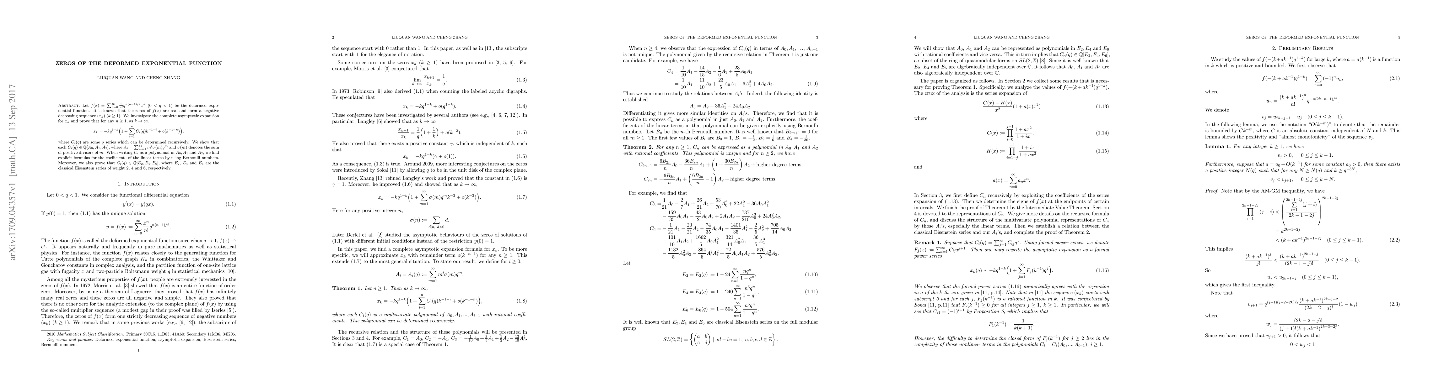 This paper investigates the zeros of the deformed exponential function $f(x)$, revealing their complete asymptotic expansion as a negative decreasing sequence. The authors prove that for large $k$, the zeros $x_k$ follow a specific form involving recursive $q$ series $C_i(q)$, which are shown to be expressible in terms of rational functions of certain series involving divisor functions and Bernoulli numbers.