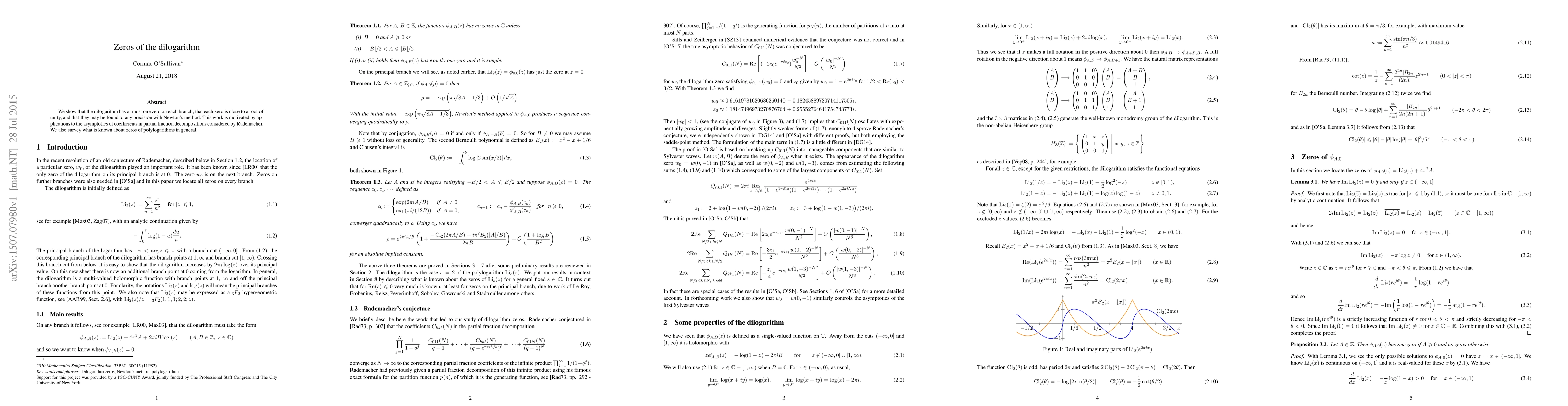 We show that the dilogarithm has at most one zero on each branch, that each zero is close to a root of unity, and that they may be found to any precision with Newton's method. This work is motivated by applications to the asymptotics of coefficients in partial fraction decompositions considered by Rademacher. We also survey what is known about zeros of polylogarithms in general.
