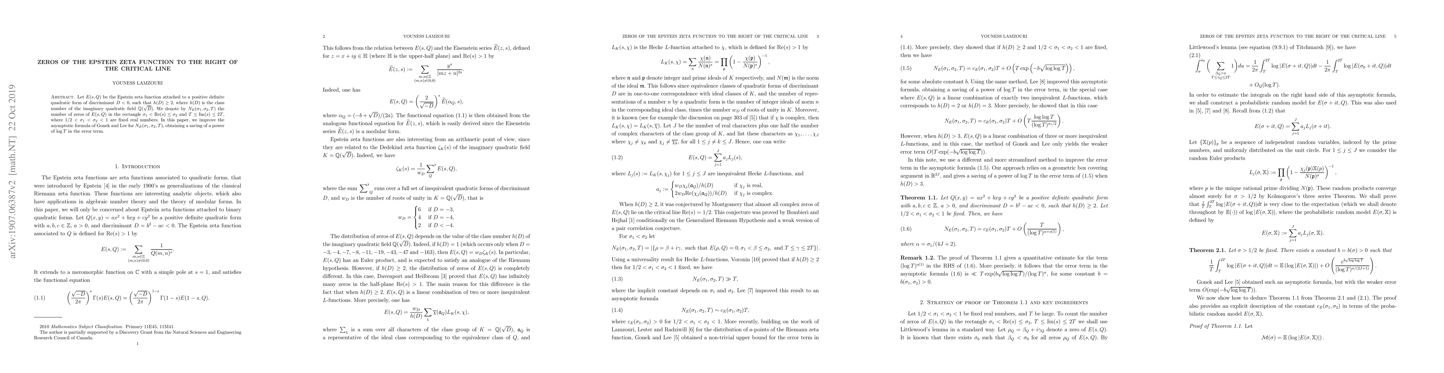 This paper improves the asymptotic formula for the number of zeros of the Epstein zeta function $E(s, Q)$ to the right of the critical line, achieving a significant reduction in the error term by a power of $\log T$. The study focuses on Epstein zeta functions associated with quadratic forms of negative discriminant and class number greater than or equal to 2.