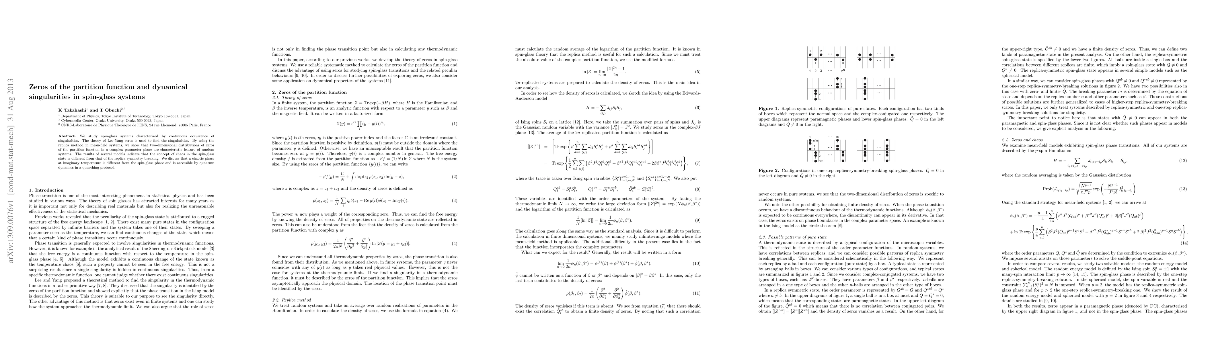 We study spin-glass systems characterized by continuous occurrence of singularities. The theory of Lee-Yang zeros is used to find the singularities. By using the replica method in mean-field systems, we show that two-dimensional distributions of zeros of the partition function in a complex parameter plane are characteristic feature of random systems. The results of several models indicate that the concept of chaos in the spin-glass state is different from that of the replica symmetry breaking. We discuss that a chaotic phase at imaginary temperature is different from the spin-glass phase and is accessible by quantum dynamics in a quenching protocol.
