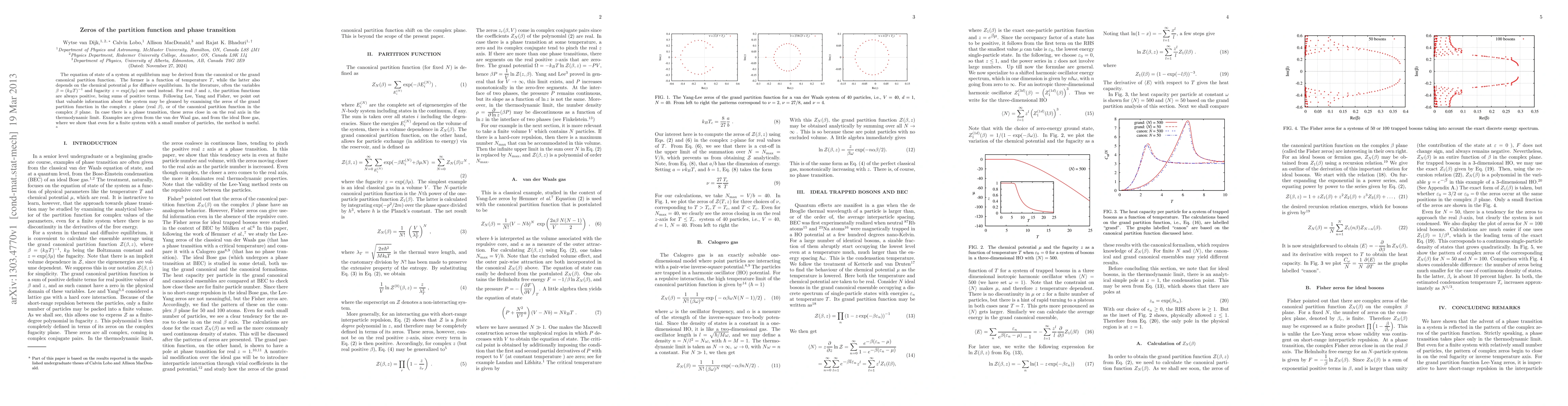 The equation of state of a system at equilibrium may be derived from the canonical or the grand canonical partition function. The former is a function of temperature T, while the latter also depends on the chemical potential \mu for diffusive equilibrium. In the literature, often the variables \beta=(k_BT)^{-1} and fugacity z=exp(\beta \mu) are used instead. For real \beta and z, the partition functions are always positive, being sums of positive terms. Following Lee, Yang and Fisher, we point out that valuable information about the system may be gleaned by examining the zeros of the grand partition function in the complex z plane (real \beta), or of the canonical partition function in the complex \beta plane. In case there is a phase transition, these zeros close in on the real axis in the thermodynamic limit. Examples are given from the van der Waal gas, and from the ideal Bose gas, where we show that even for a finite system with a small number of particles, the method is useful.