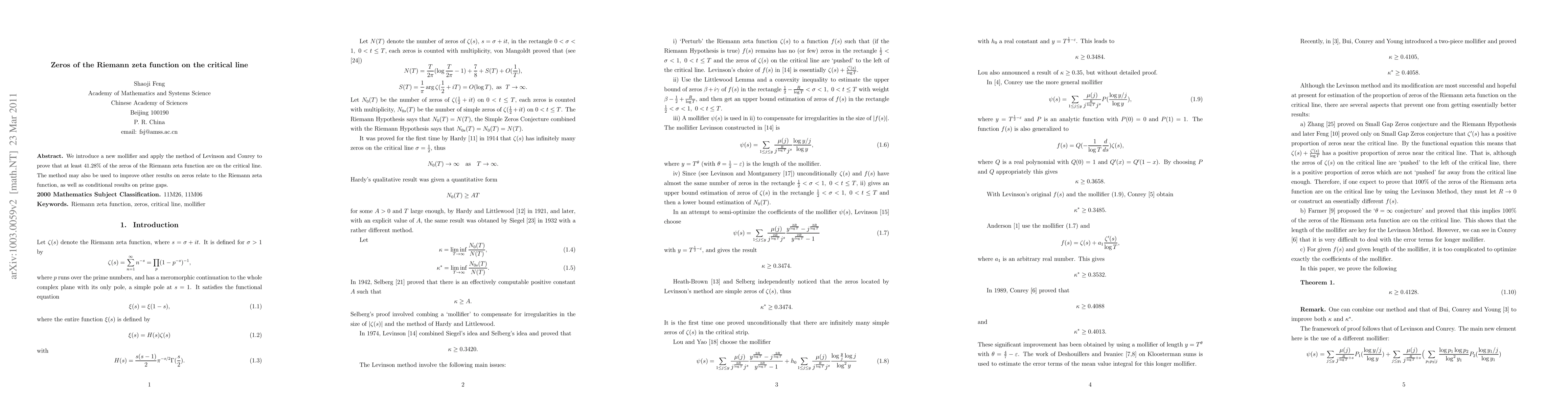 Summary: The research demonstrates that at least 41.28% of the zeros of the Riemann zeta function lie on the critical line, providing significant insight into the distribution of these zeros.