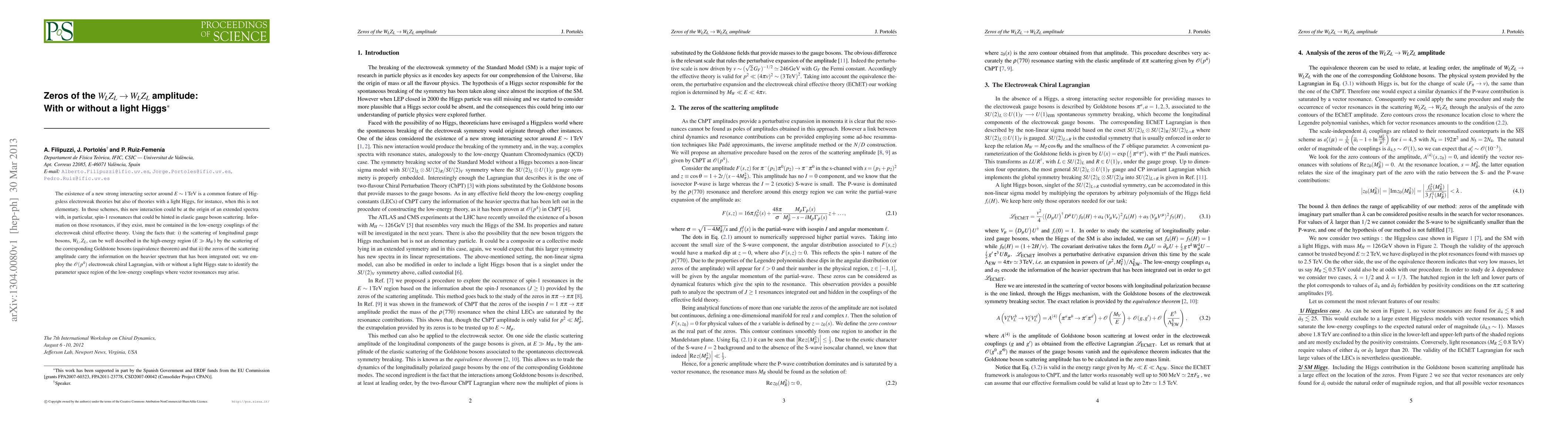 This paper investigates the zeros of the $W_L Z_L \rightarrow W_L Z_L$ amplitude in the context of Higgsless electroweak theories and theories with a non-elementary light Higgs, aiming to identify regions where spin-1 resonances could emerge. It uses the O(p^4) electroweak chiral Lagrangian to explore the low-energy couplings and determine the parameter space for potential vector resonances.
