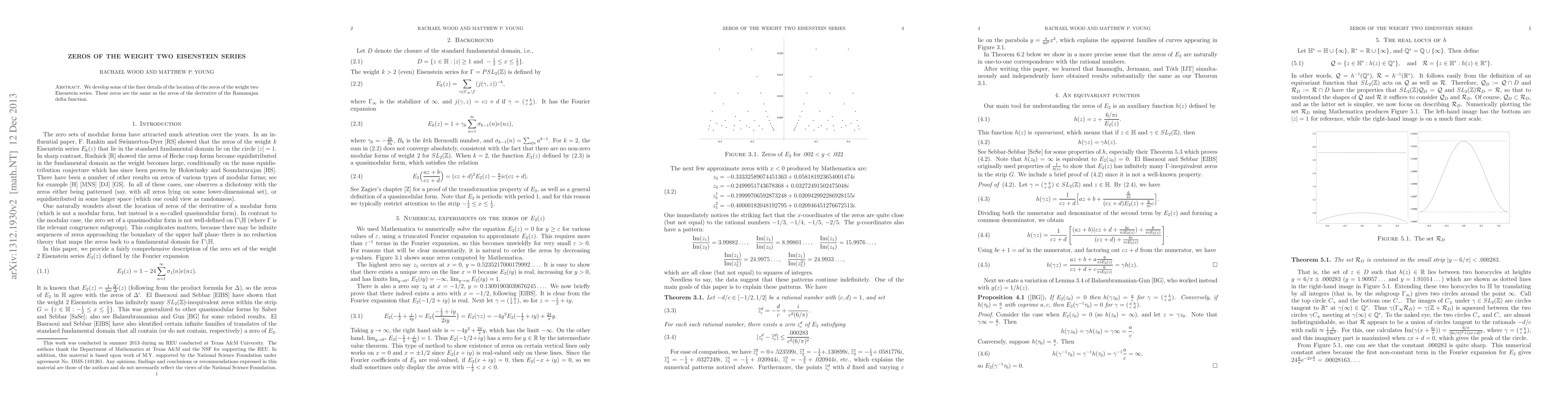Summary: This research delves into the precise locations of zeros in the weight two Eisenstein series, which coincide with those of the derivative of the Ramanujan delta function. The study provides detailed insights into these mathematical structures.