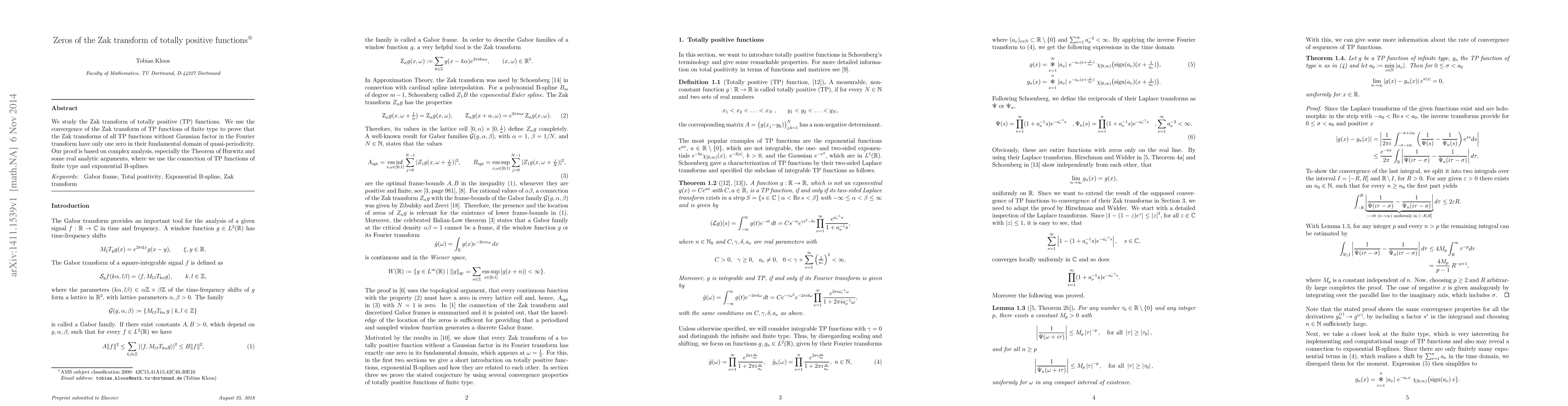 This paper investigates the zeros of the Zak transform of totally positive functions, proving that those without Gaussian factors in their Fourier transform have exactly one zero in their fundamental domain of quasi-periodicity. The proof leverages complex analysis, Hurwitz's Theorem, and real analytic arguments, linking TP functions of finite type to exponential B-splines.