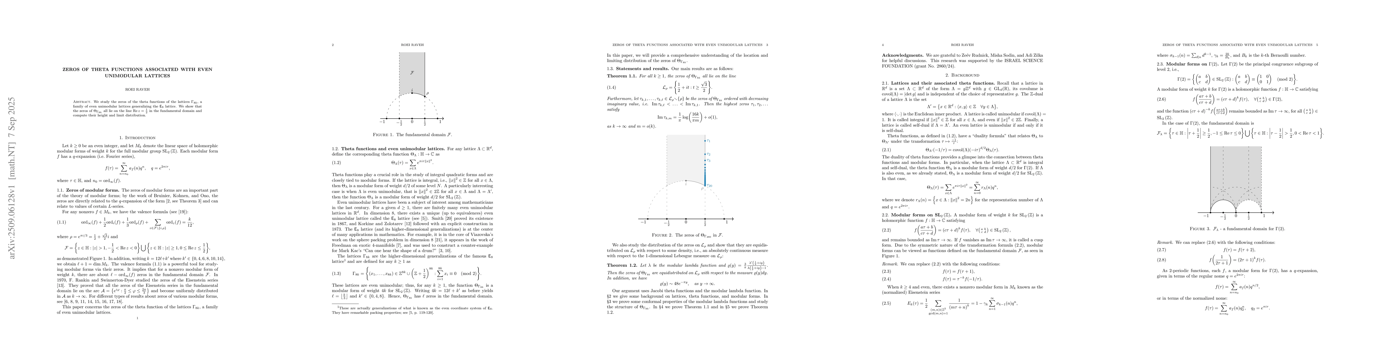 We study the zeros of the theta functions of the lattices $\Gamma_{8k}$, a family of even unimodular lattices generalizing the $\mathsf{E}_{8}$ lattice. We show that the zeros of $\Theta_{\Gamma_{8k}}$ all lie on the line $\Re z =\frac{1}{2}$ in the fundamental domain and compute their height and limit distribution.