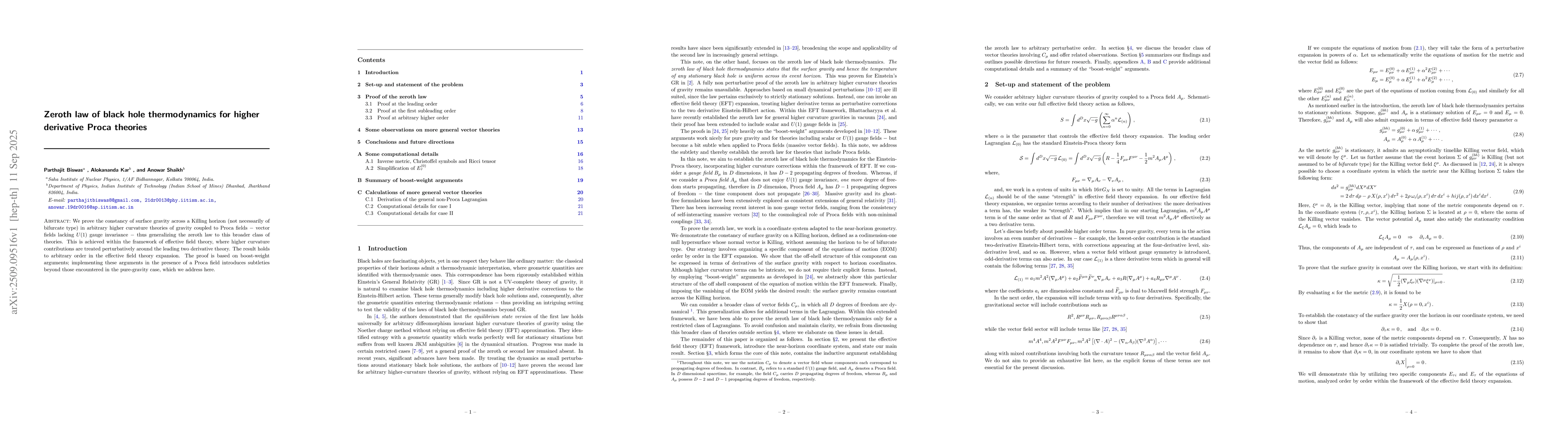 We prove the constancy of surface gravity across a Killing horizon (not necessarily of bifurcate type) in arbitrary higher curvature theories of gravity coupled to Proca fields $-$ vector fields lacking $U(1)$ gauge invariance $-$ thus generalizing the zeroth law to this broader class of theories. This is achieved within the framework of effective field theory, where higher curvature contributions are treated perturbatively around the leading two derivative theory. The result holds to arbitrary order in the effective field theory expansion. The proof is based on boost-weight arguments; implementing these arguments in the presence of a Proca field introduces subtleties beyond those encountered in the pure-gravity case, which we address here.