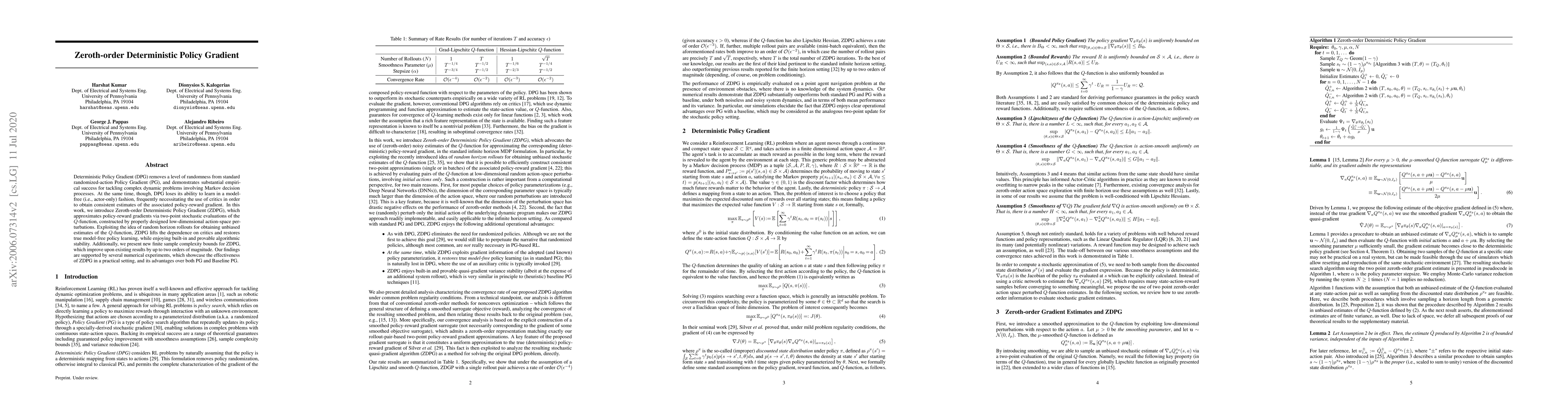 Zeroth-order Deterministic Policy Gradient (ZDPG) restores model-free policy learning by approximating policy-reward gradients through two-point stochastic evaluations, achieving significant algorithmic stability and improving finite sample complexity by up to two orders of magnitude. Numerical experiments demonstrate ZDPG's effectiveness over traditional Policy Gradient and Baseline PG.