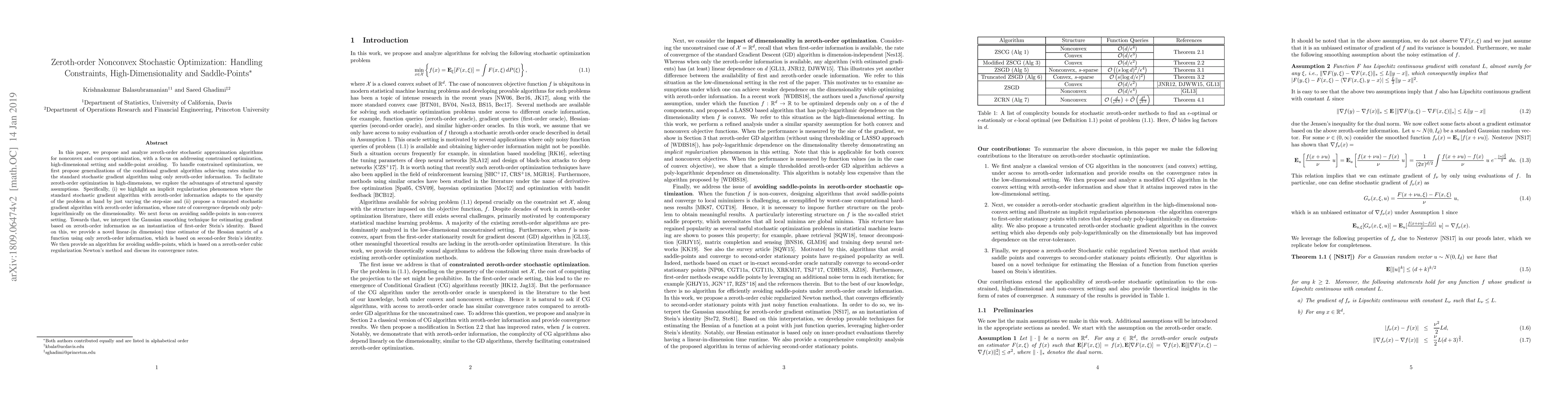 This paper proposes zeroth-order stochastic approximation algorithms for nonconvex optimization, focusing on constrained optimization, high-dimensional settings, and saddle-point avoidance. It introduces methods leveraging structural sparsity and a novel Hessian estimator based on Stein's identity to achieve convergence rates that adapt to problem dimensionality and avoid saddle points.