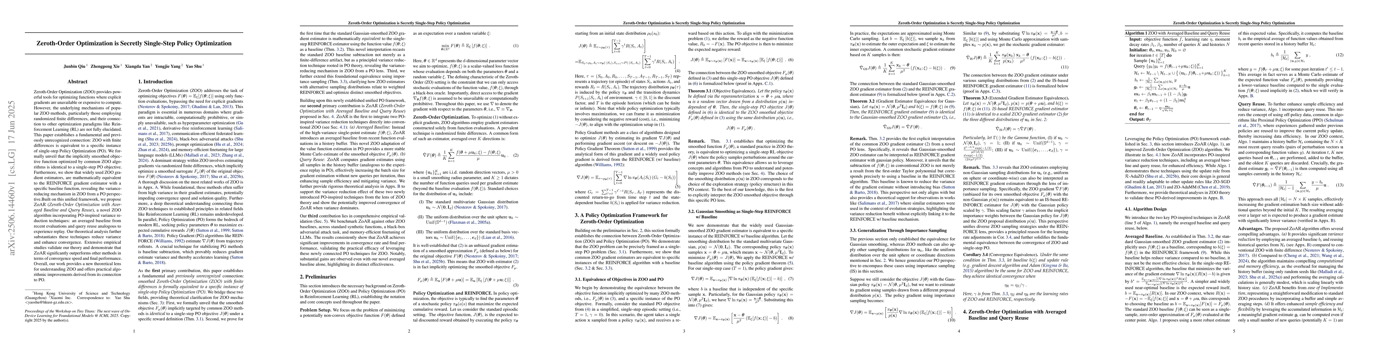Zeroth-Order Optimization (ZOO) provides powerful tools for optimizing functions where explicit gradients are unavailable or expensive to compute. However, the underlying mechanisms of popular ZOO methods, particularly those employing randomized finite differences, and their connection to other optimization paradigms like Reinforcement Learning (RL) are not fully elucidated. This paper establishes a fundamental and previously unrecognized connection: ZOO with finite differences is equivalent to a specific instance of single-step Policy Optimization (PO). We formally unveil that the implicitly smoothed objective function optimized by common ZOO algorithms is identical to a single-step PO objective. Furthermore, we show that widely used ZOO gradient estimators, are mathematically equivalent to the REINFORCE gradient estimator with a specific baseline function, revealing the variance-reducing mechanism in ZOO from a PO perspective.Built on this unified framework, we propose ZoAR (Zeroth-Order Optimization with Averaged Baseline and Query Reuse), a novel ZOO algorithm incorporating PO-inspired variance reduction techniques: an averaged baseline from recent evaluations and query reuse analogous to experience replay. Our theoretical analysis further substantiates these techniques reduce variance and enhance convergence. Extensive empirical studies validate our theory and demonstrate that ZoAR significantly outperforms other methods in terms of convergence speed and final performance. Overall, our work provides a new theoretical lens for understanding ZOO and offers practical algorithmic improvements derived from its connection to PO.