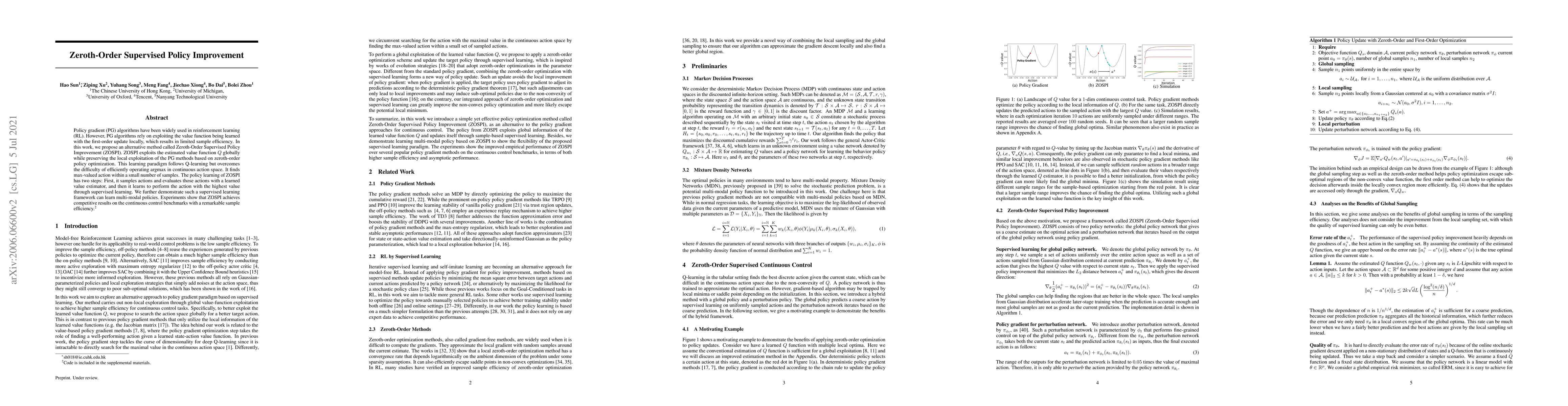 This paper proposes Zeroth-Order Supervised Policy Improvement (ZOSPI), a reinforcement learning method that globally uses an estimated value function while maintaining local exploitation, achieving competitive results and remarkable sample efficiency on continuous control benchmarks. ZOSPI employs supervised learning to efficiently find the best action in continuous spaces.