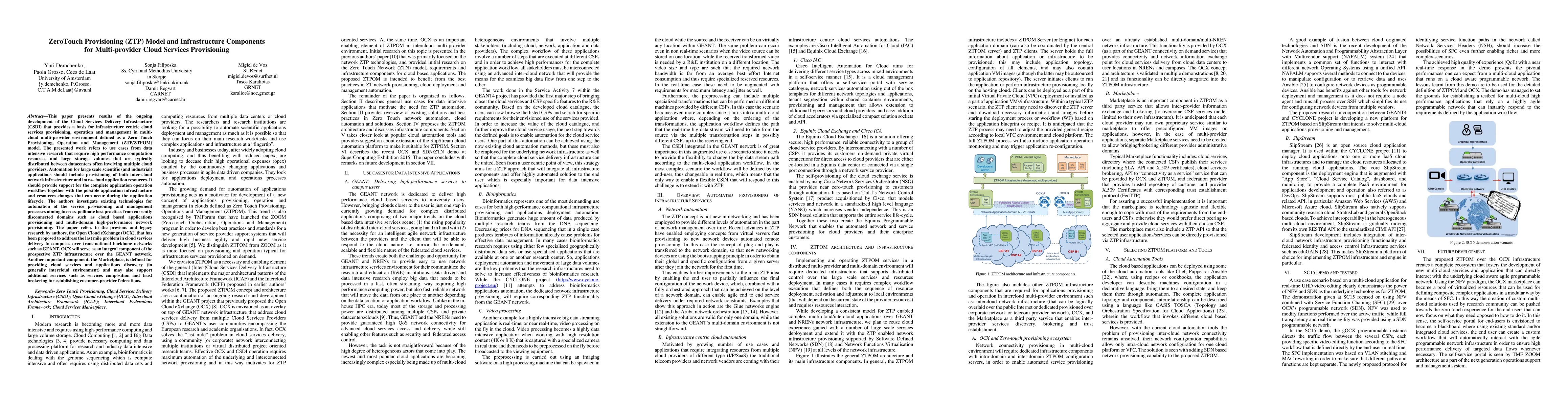 This paper develops the Cloud Services Delivery Infrastructure (CSDI) for multi-provider cloud services provisioning, focusing on a Zero Touch Provisioning (ZTP) model. It aims to automate large-scale scientific applications by integrating inter-cloud network infrastructure and intra-cloud resources, leveraging previous work on Open Cloud eXchange (OCX) and introducing a Marketplace for service discovery and composition.
