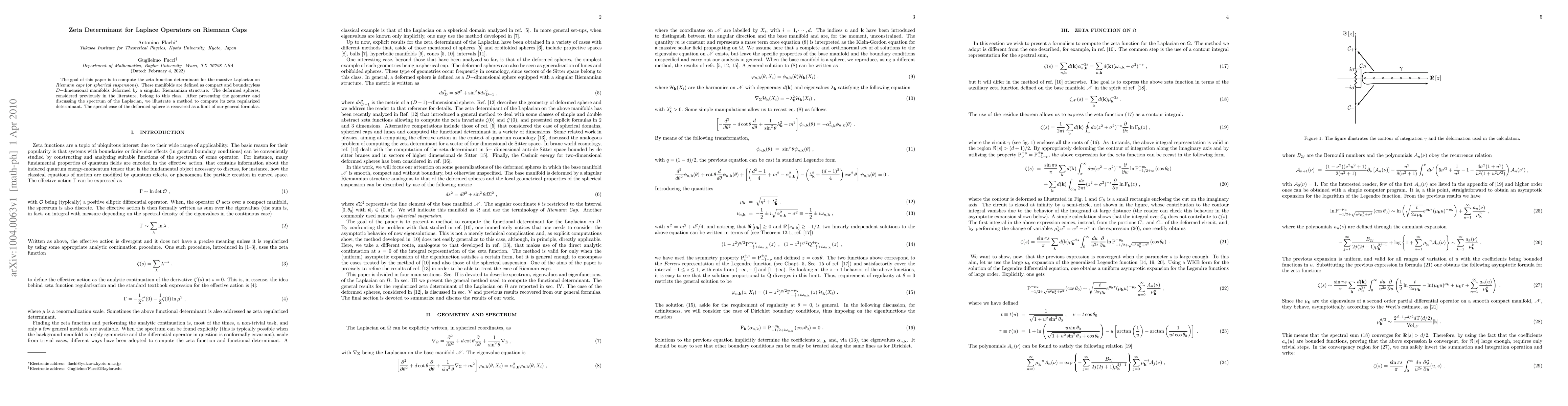 This paper computes the zeta determinant for the massive Laplacian on Riemann caps, a class of manifolds with singular Riemannian structure, and recovers the special case of deformed spheres as a limit.