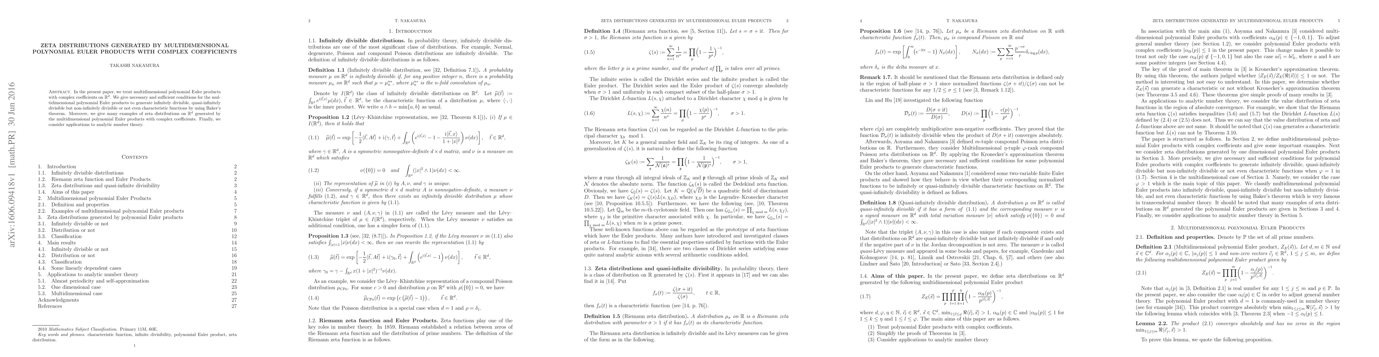 This paper explores multidimensional polynomial Euler products with complex coefficients, providing conditions for generating zeta distributions on ${\mathbb{R}}^d$ and discussing their applications to analytic number theory. It also illustrates examples of these distributions and their quasi-infinite divisibility properties.