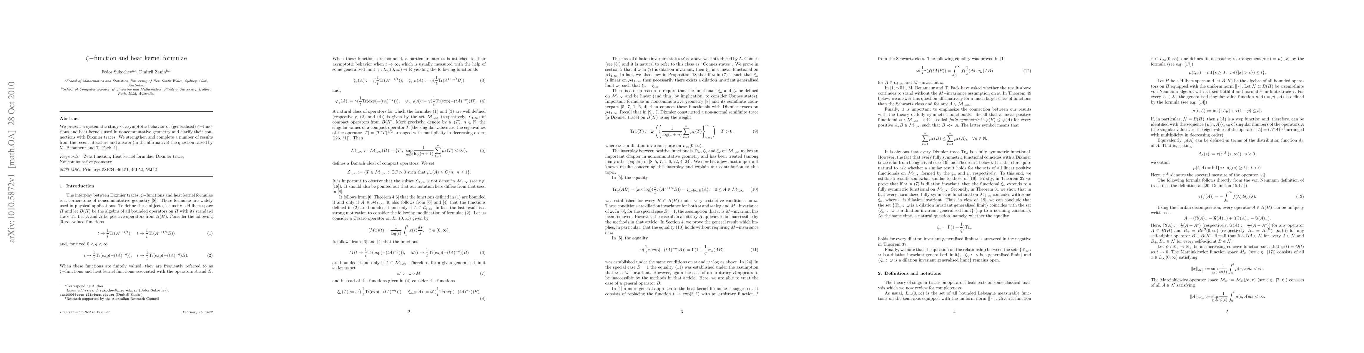 This paper systematically investigates the asymptotic behavior of generalised $\zeta$-functions and heat kernels in noncommutative geometry, linking them to Dixmier traces and resolving questions posed by Benameur and Fack. It strengthens and completes prior findings in the field.