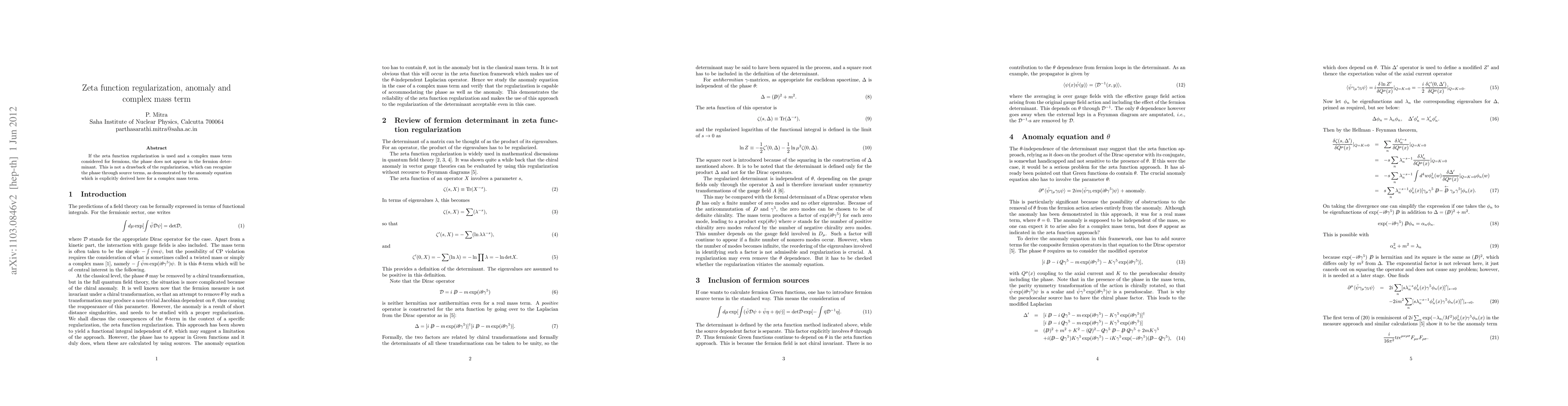Summary: Zeta function regularization effectively handles complex mass terms in fermions without introducing phases, utilizing source terms to recognize the phase, and explicitly deriving the anomaly equation for such terms.