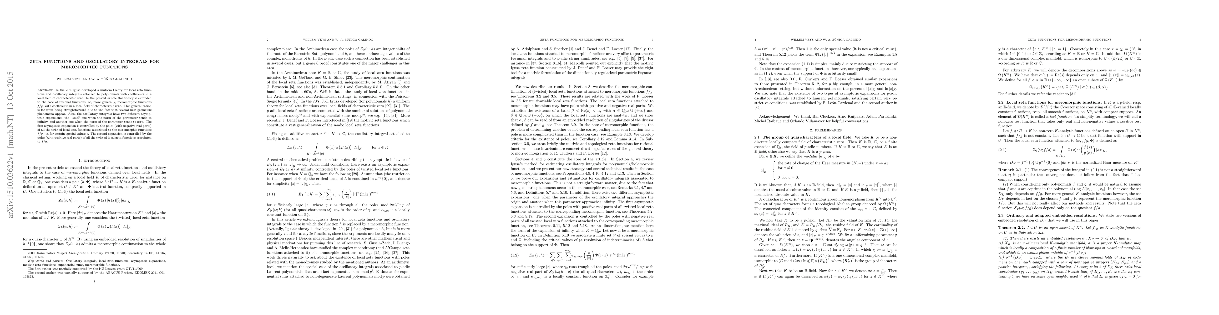 This paper extends Igusa's 1970s theory on local zeta functions and oscillatory integrals for polynomials to meromorphic functions, addressing new geometric phenomena and revealing two distinct asymptotic expansions for the integrals. The study links these expansions to the poles of twisted local zeta functions.