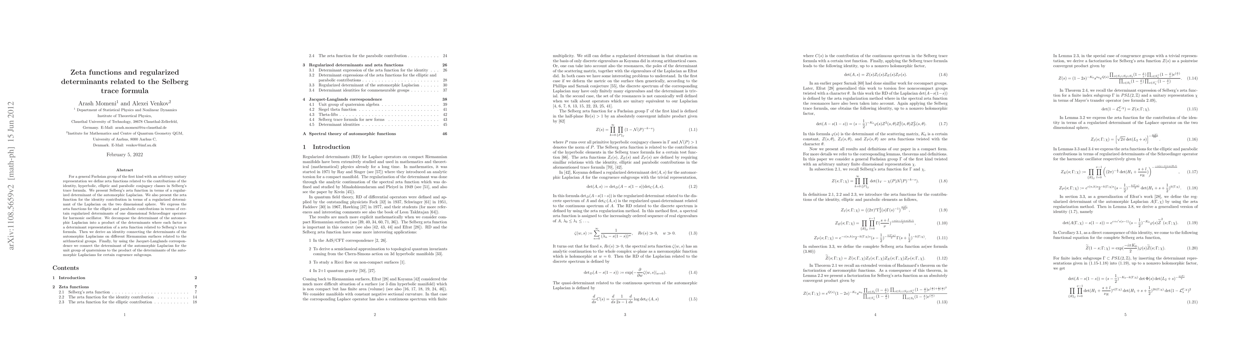 This paper defines zeta functions for various conjugacy classes in Selberg's trace formula, presenting them in terms of regularized determinants, particularly of the automorphic Laplacian and the Laplacian on the two-dimensional sphere. It establishes connections between determinants of Laplacians across different Riemann surfaces and uses the Jacquet-Langlands correspondence to relate determinants for quaternionic unit groups and congruence subgroups.
