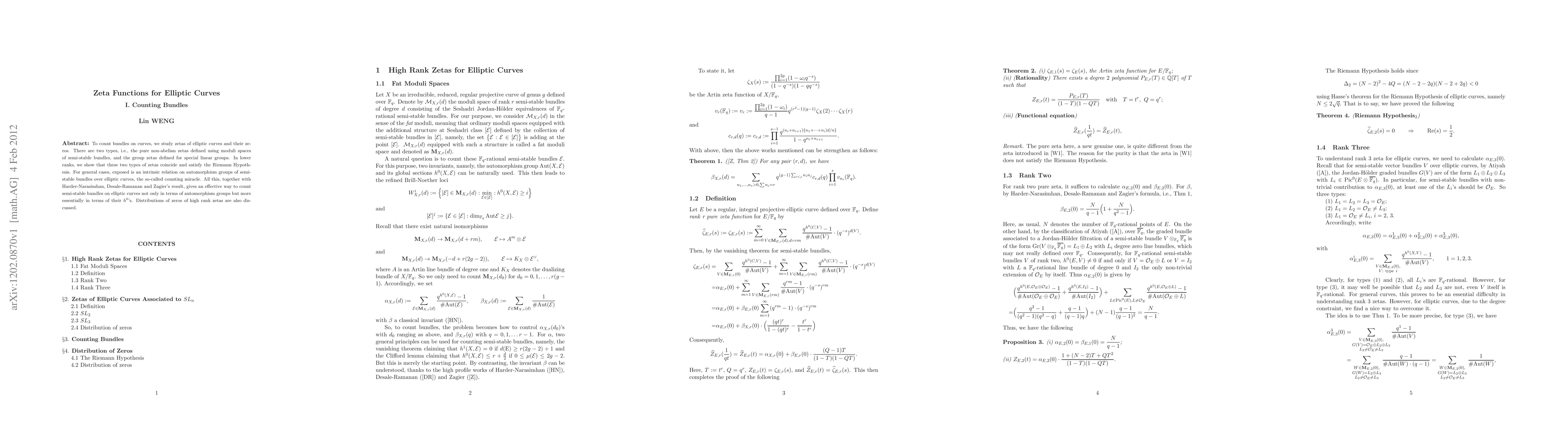 This paper investigates zeta functions associated with elliptic curves, focusing on counting bundles through pure non-abelian and group zetas. It demonstrates that these zetas coincide in lower ranks and satisfy the Riemann Hypothesis, revealing an intrinsic relation in higher ranks known as the counting miracle.