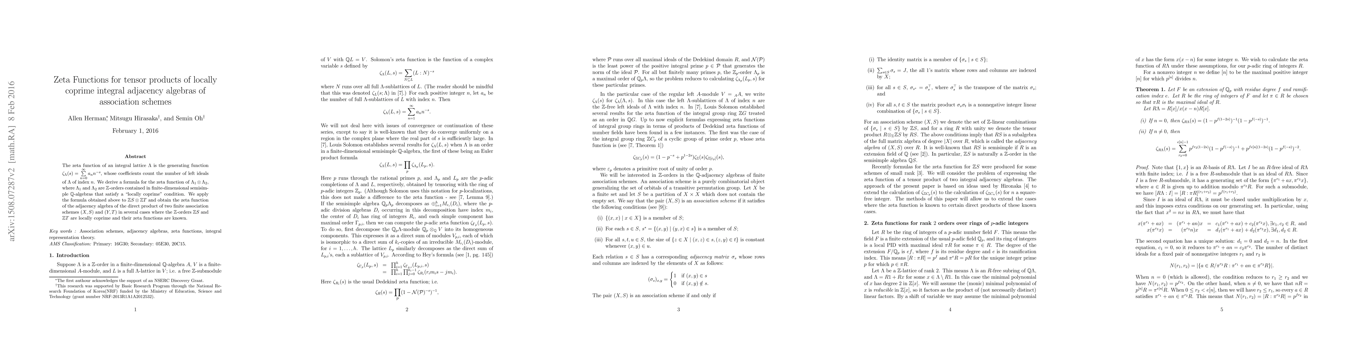 The zeta function of an integral lattice $\Lambda$ is the generating function $\zeta_{\Lambda}(s) = \sum\limits_{n=0}^{\infty} a_n n^{-s}$, whose coefficients count the number of left ideals of $\Lambda$ of index $n$. We derive a formula for the zeta function of $\Lambda_1 \otimes \Lambda_2$, where $\Lambda_1$ and $\Lambda_2$ are $\mathbb{Z}$-orders contained in finite-dimensional semisimple $\mathbb{Q}$-algebras that satisfy a "locally coprime" condition. We apply the formula obtained above to $\mathbb{Z}S \otimes \mathbb{Z}T$ and obtain the zeta function of the adjacency algebra of the direct product of two finite association schemes $(X,S)$ and $(Y,T)$ in several cases where the $\mathbb{Z}$-orders $\mathbb{Z}S$ and $\mathbb{Z}T$ are locally coprime and their zeta functions are known.