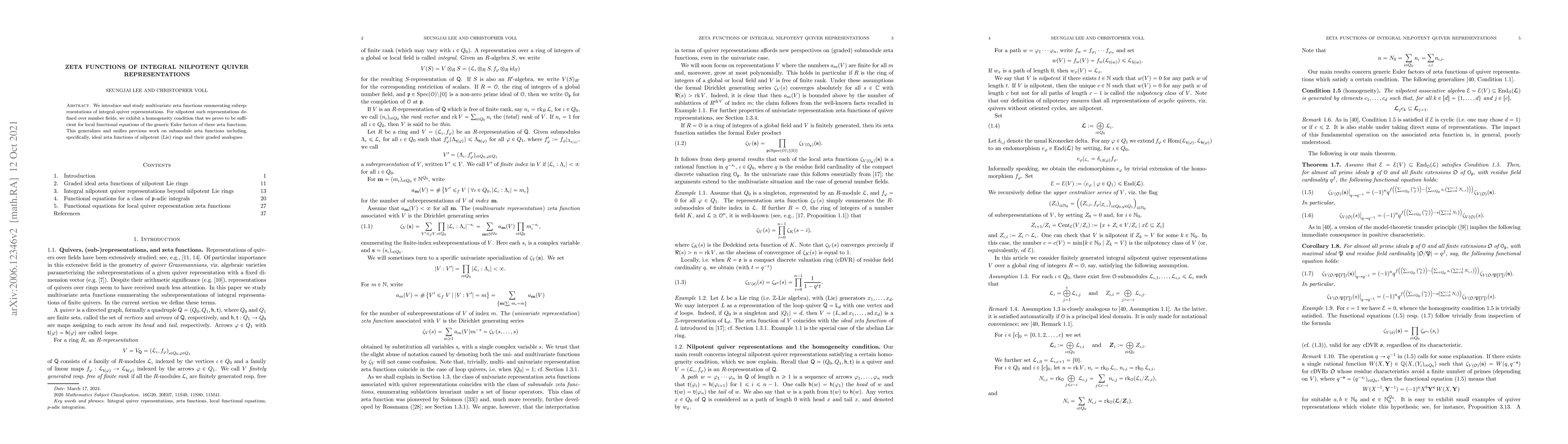 This paper introduces multivariate zeta functions for integral nilpotent quiver representations and proves a homogeneity condition ensuring local functional equations for their generic Euler factors, thus generalizing previous studies on submodule and ideal zeta functions.