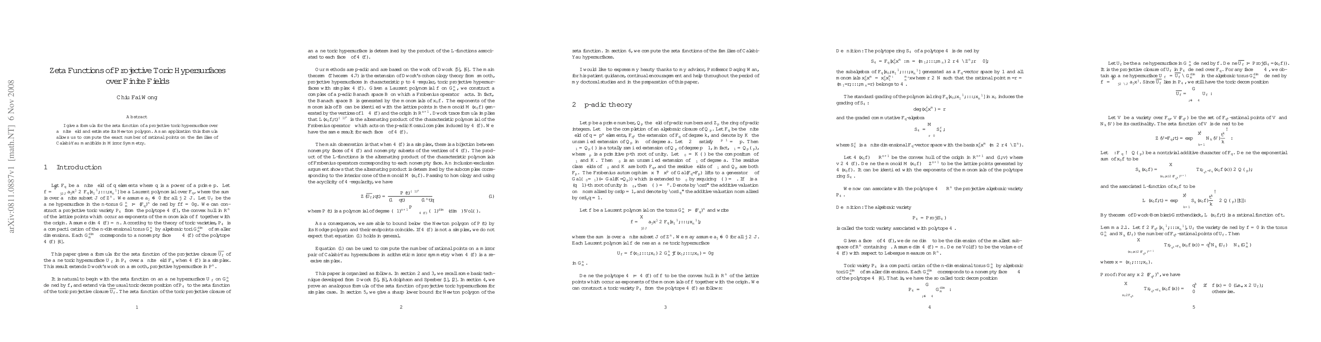 This paper presents a formula for the zeta function of projective toric hypersurfaces over finite fields and estimates its Newton polygon, enabling the computation of rational points on families of Calabi-Yau manifolds relevant to Mirror Symmetry.