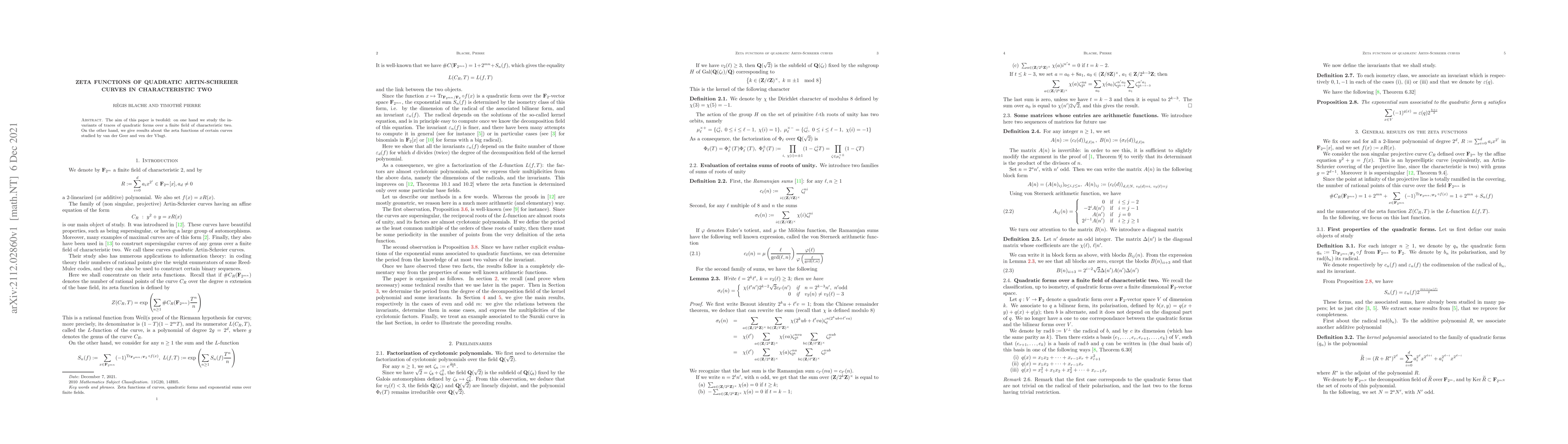 The aim of this paper is twofold: on one hand we study the invariants of traces of quadratic forms over a finite field of characteristic two. On the other hand, we give results about the zeta functions of certain curves studied by van der Geer and ven der Vlugt.
