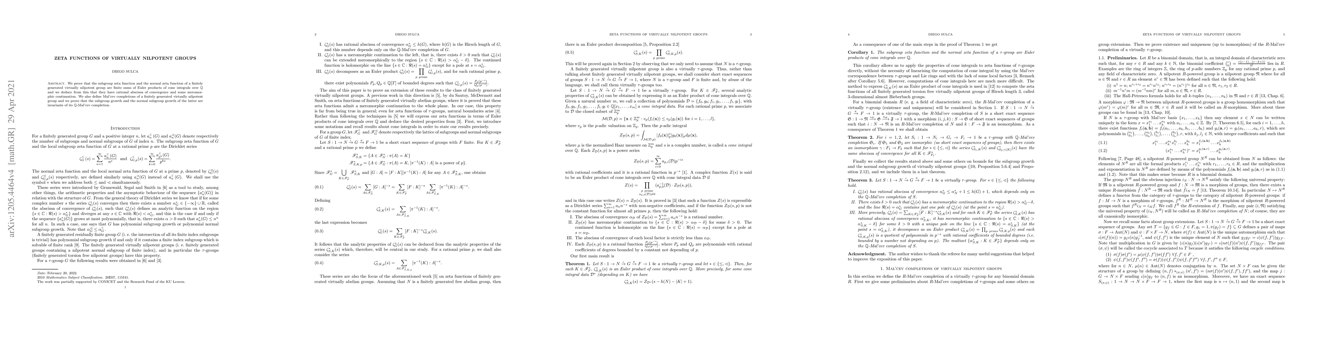 The paper proves that zeta functions of virtually nilpotent groups can be expressed as finite sums of Euler products over the rational numbers, leading to new insights into their properties.