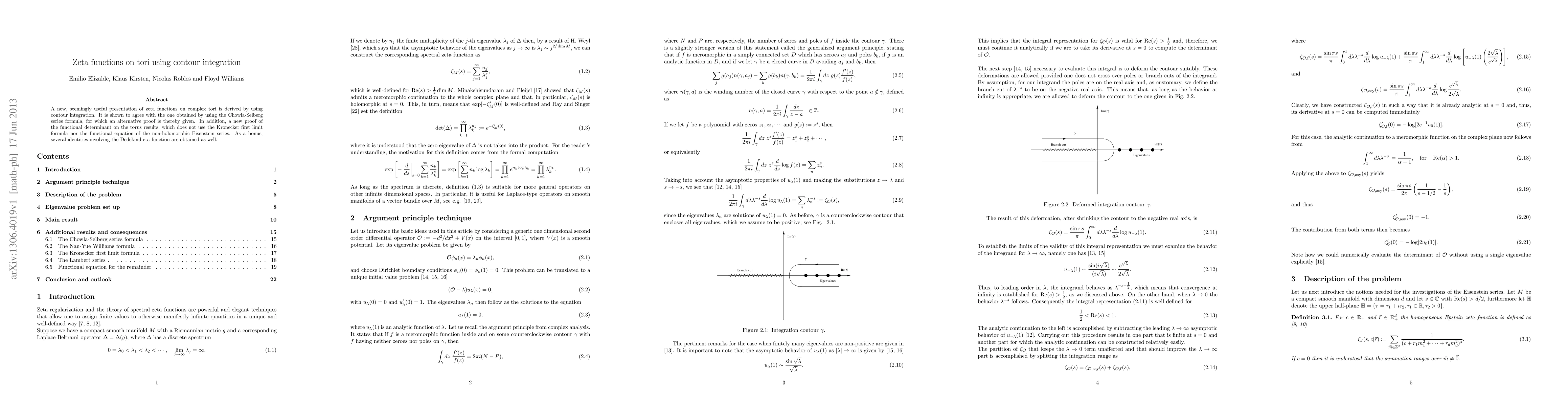 A new, seemingly useful presentation of zeta functions on complex tori is derived by using contour integration. It is shown to agree with the one obtained by using the Chowla-Selberg series formula, for which an alternative proof is thereby given. In addition, a new proof of the functional determinant on the torus results, which does not use the Kronecker first limit formula nor the functional equation of the non-holomorphic Eisenstein series. As a bonus, several identities involving the Dedekind eta function are obtained as well.