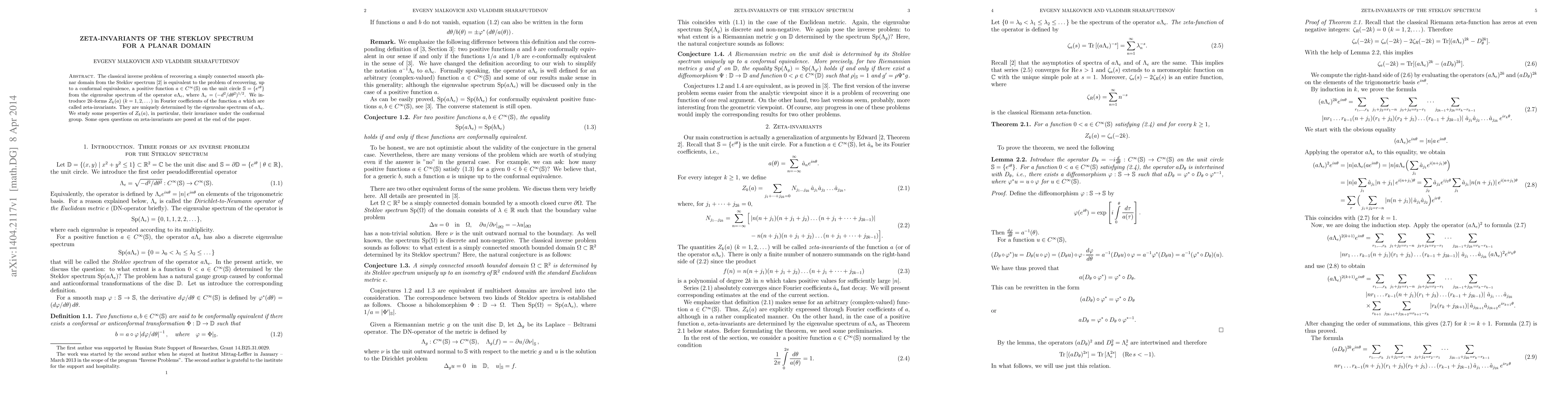 The classical inverse problem of recovering a simply connected smooth planar domain from the Steklov spectrum \cite{E} is equivalent to the problem of recovering, up to a conformal equivalence, a positive function $a\in C^\infty({\mathbb S})$ on the unit circle ${\mathbb S}=\{e^{i\theta}\}$ from the eigenvalue spectrum of the operator $a\Lambda_e$, where $\Lambda_e=(-d^2/d\theta^2)^{1/2}$. We introduce $2k$-forms $Z_k(a)\ (k=1,2,\dots)$ in Fourier coefficients of the function $a$ which are called zeta-invariants. They are uniquely determined by the eigenvalue spectrum of $a\Lambda_e$. We study some properties of $Z_k(a)$, in particular, their invariance under the conformal group. Some open questions on zeta-invariants are posed at the end of the paper.