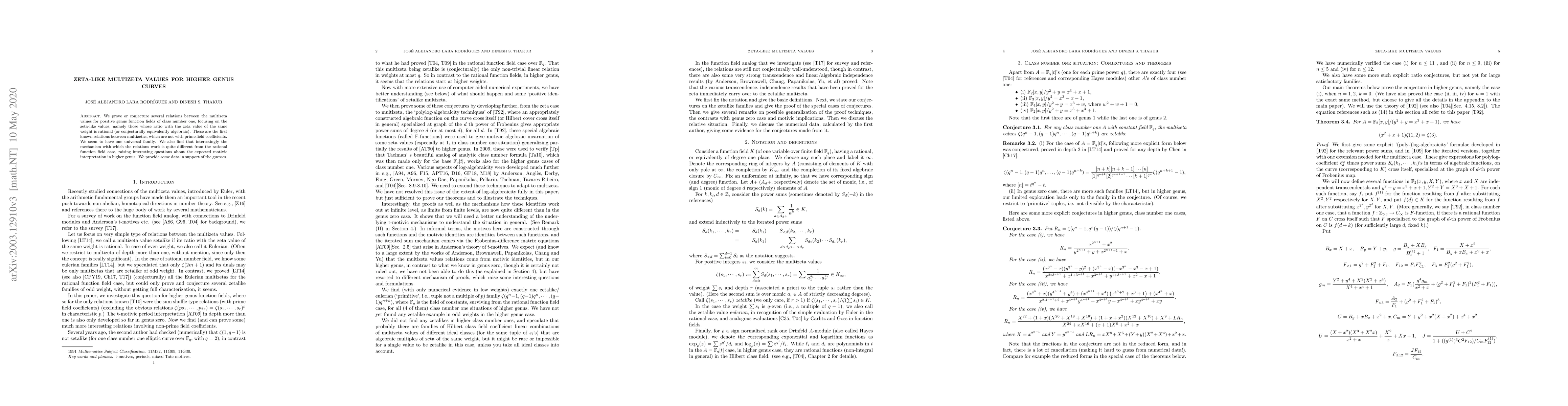 This paper proves relations between multizeta values for positive genus function fields of class number one, focusing on zeta-like values with rational ratios to the zeta value. It also raises questions about expected motivic interpretation in higher genus.