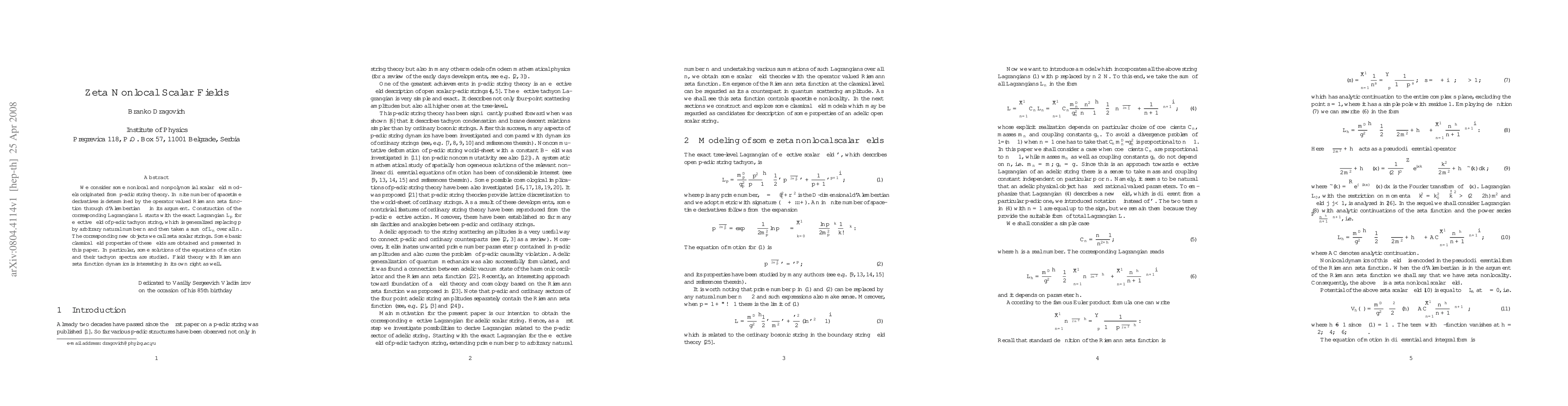 We consider some nonlocal and nonpolynomial scalar field models originated from p-adic string theory. Infinite number of spacetime derivatives is determined by the operator valued Riemann zeta function through d'Alembertian $\Box$ in its argument. Construction of the corresponding Lagrangians L starts with the exact Lagrangian $\mathcal{L}_p$ for effective field of p-adic tachyon string, which is generalized replacing p by arbitrary natural number n and then taken a sum of $\mathcal{L}_n$ over all n. The corresponding new objects we call zeta scalar strings. Some basic classical field properties of these fields are obtained and presented in this paper. In particular, some solutions of the equations of motion and their tachyon spectra are studied. Field theory with Riemann zeta function dynamics is interesting in its own right as well.
