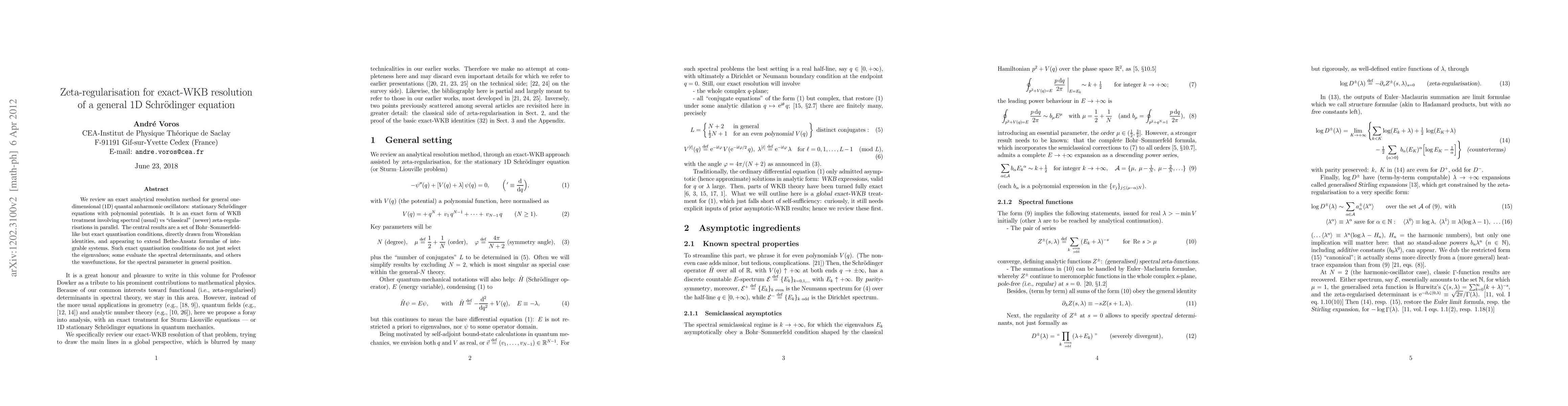We review an exact analytical resolution method for general one-dimensional (1D) quantal anharmonic oscillators: stationary Schr\"odinger equations with polynomial potentials. It is an exact form of WKB treatment involving spectral (usual) vs "classical" (newer) zeta-regularisations in parallel. The central results are a set of Bohr--Sommerfeld-like but exact quantisation conditions, directly drawn from Wronskian identities, and appearing to extend Bethe-Ansatz formulae of integrable systems. Such exact quantisation conditions do not just select the eigenvalues; some evaluate the spectral determinants, and others the wavefunctions, for the spectral parameter in general position.