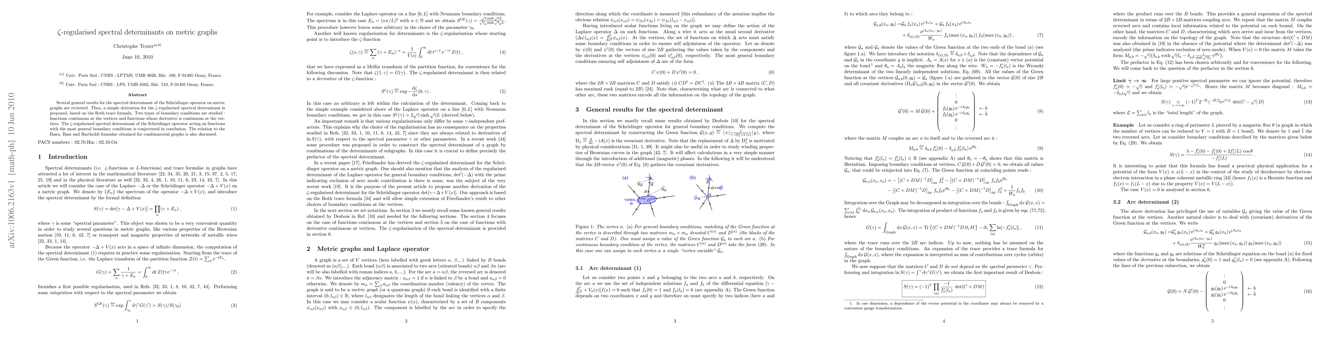 This paper reviews results on the spectral determinant of the Schrödinger operator on metric graphs and proposes a derivation for the $\zeta$-regularised spectral determinant using the Roth trace formula. It studies two types of boundary conditions and concludes with a conjecture for the most general boundary conditions, linking to Ihara, Bass, and Bartholdi formulae for combinatorial graphs.