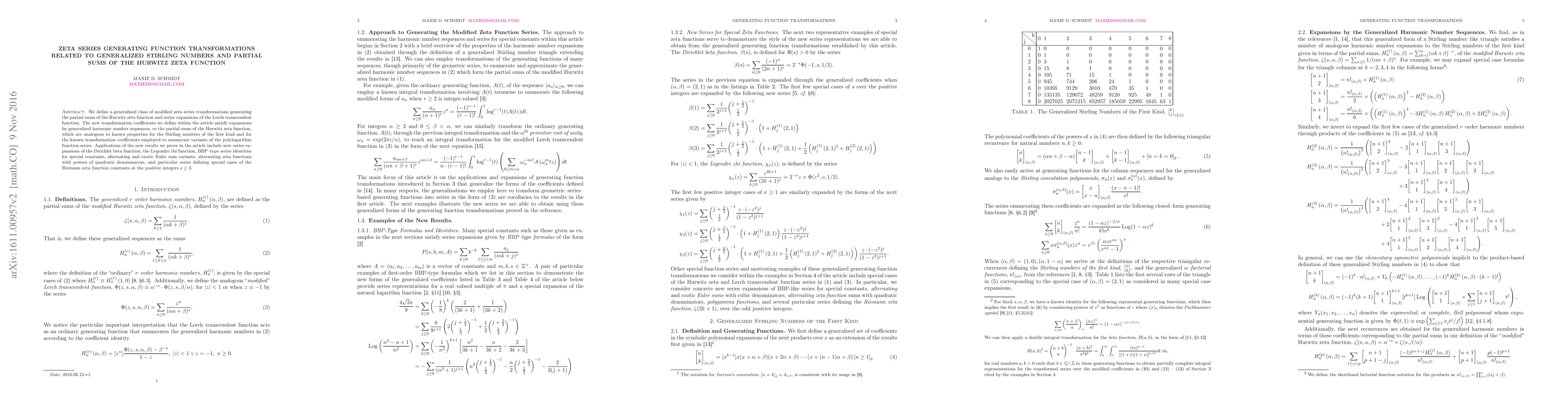 We define a generalized class of modified zeta series transformations generating the partial sums of the Hurwitz zeta function and series expansions of the Lerch transcendent function. The new transformation coefficients we define within the article satisfy expansions by generalized harmonic number sequences, or the partial sums of the Hurwitz zeta function, which are analogous to known properties for the Stirling numbers of the first kind and for the known transformation coefficients employed to enumerate variants of the polylogarithm function series. Applications of the new results we prove in the article include new series expansions of the Dirichlet beta function, the Legendre chi function, BBP-type series identities for special constants, alternating and exotic Euler sum variants, alternating zeta functions with powers of quadratic denominators, and particular series defining special cases of the Riemann zeta function constants at the positive integers $s \geq 3$.