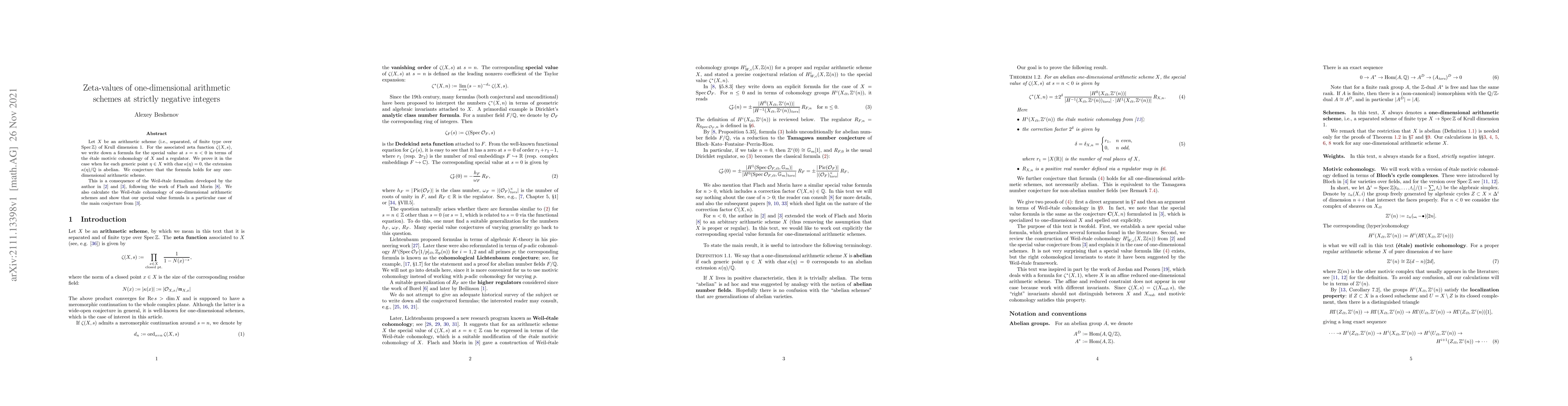 Let $X$ be an arithmetic scheme (i.e., separated, of finite type over $\operatorname{Spec} \mathbb{Z}$) of Krull dimension $1$. For the associated zeta function $\zeta (X,s)$, we write down a formula for the special value at $s = n < 0$ in terms of the \'{e}tale motivic cohomology of $X$ and a regulator. We prove it in the case when for each generic point $\eta \in X$ with $\operatorname{char} \kappa (\eta) = 0$, the extension $\kappa (\eta)/\mathbb{Q}$ is abelian. We conjecture that the formula holds for any one-dimensional arithmetic scheme. This is a consequence of the Weil-\'{e}tale formalism developed by the author in [arXiv:2012.11034] and [arXiv:2102.12114], following the work of Flach and Morin (Doc. Math. 23 (2018), 1425--1560). We also calculate the Weil-\'{e}tale cohomology of one-dimensional arithmetic schemes and show that our special value formula is a particular case of the main conjecture from [arXiv:2102.12114].