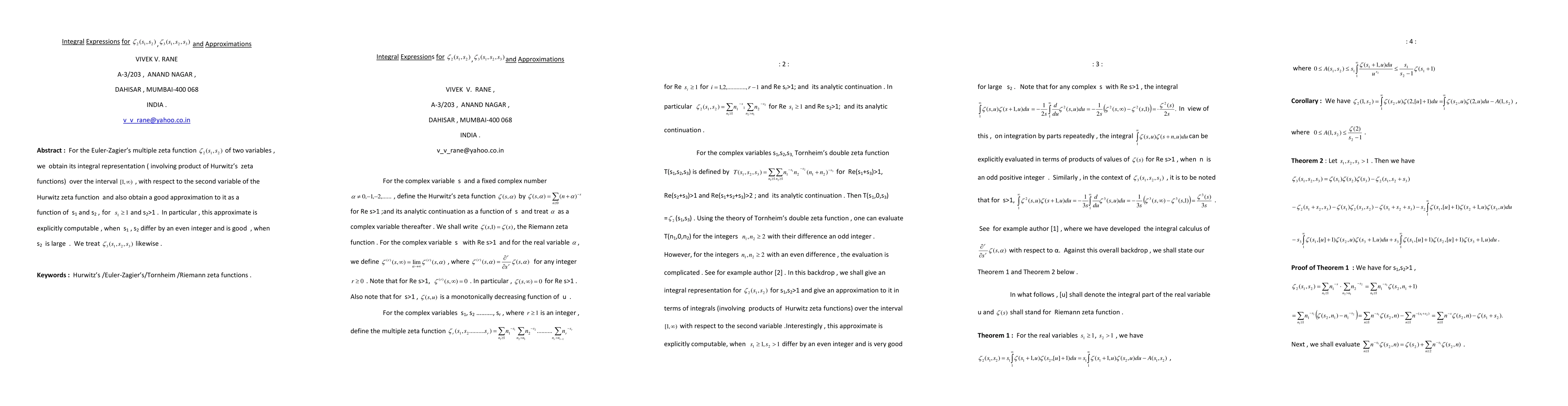 For the multiple zeta function zeta2(s1,s2) of two variables,we obtain its integral representation(involving product of Hurwitz zeta functions) over the interval [1,infinity),with respect to second variable of Hurwitz zeta function and also obtain a good approximate to it as a function of s1 and s2,for s1>=1 and s2>1.In particular this approximate is explicitly computable,when s1,s2 differ by an even integer and is good,when s2 is large.We treat zeta3(s1,s2,s3) likewise.