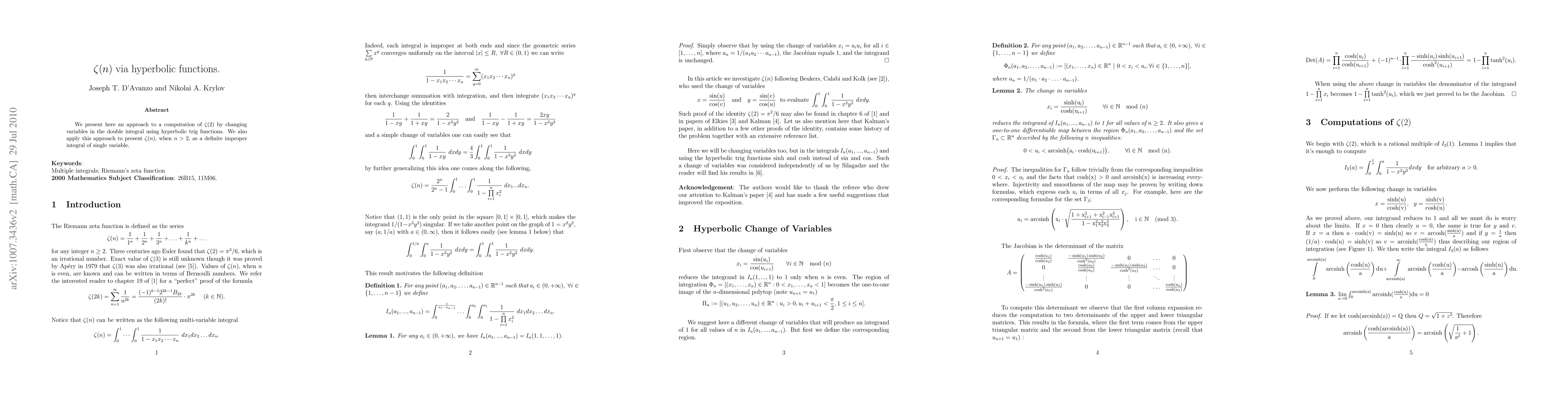 We present here an approach to a computation of $\zeta(2)$ by changing variables in the double integral using hyperbolic trig functions. We also apply this approach to present $\zeta(n)$, when $n>2$, as a definite improper integral of single variable.