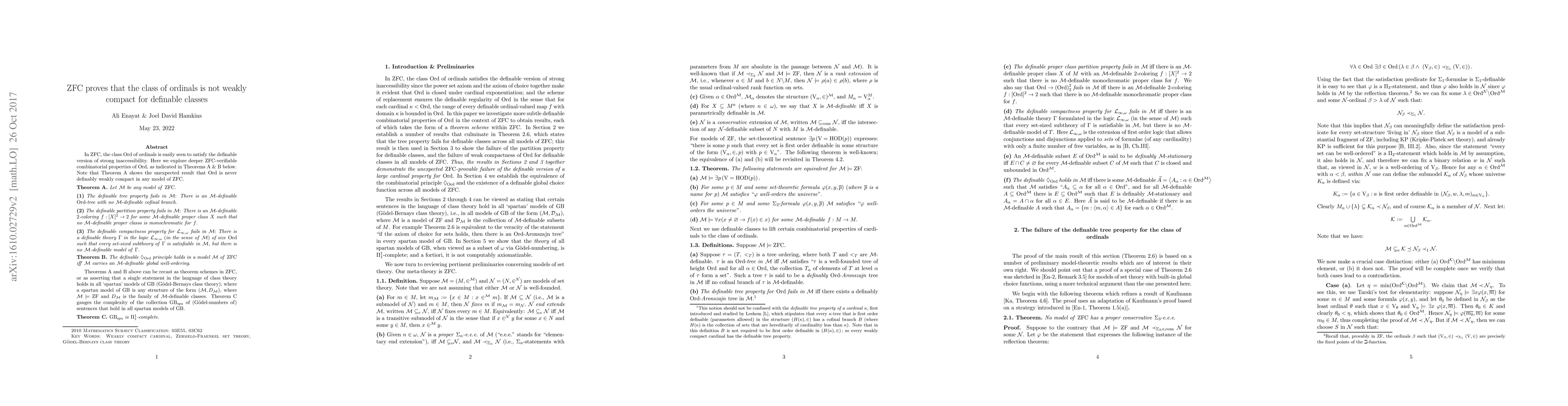 We prove that the class of all ordinals Ord is not weakly compact with respect to definable classes. Specifically, in any model of ZFC, the definable tree property fails for Ord, in that there is a definable Ord tree with no definable cofinal branch; the definable partition property fails, in that there is a definable 2-coloring of pairs from a certain definable proper class, with no definable homogeneous proper class; and the definable compactness property fails for $\mathcal{L}_{\infty,\omega}$, in that there is a definable theory in this logic all of whose set-sized subtheories are satisfiable, but which has no definable proper class model. In addition, we prove that the definable diamond principle $\Diamond_{\rm Ord}$ holds if and only if there is a definable well-ordering of the universe. And we prove that the common theory of all spartan models of G\"odel-Bernays set theory, those having only definable classes, is $\Pi^1_1$-complete.