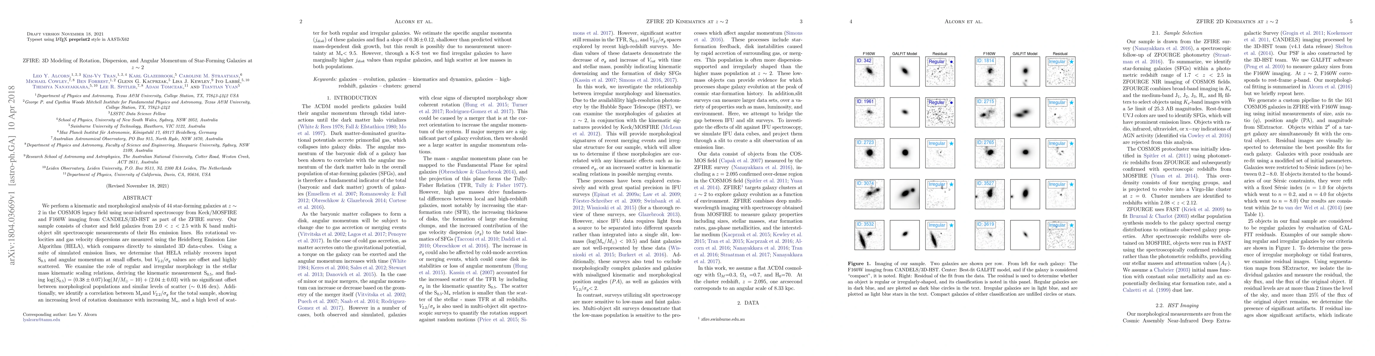 The ZFIRE survey analyzes 44 star-forming galaxies at $z\sim2$ using near-infrared spectroscopy and imaging, revealing scaling relations between stellar mass and kinematic properties, with no significant morphological offset. Irregular galaxies show marginally higher specific angular momenta than regular ones, though both have high scatter.