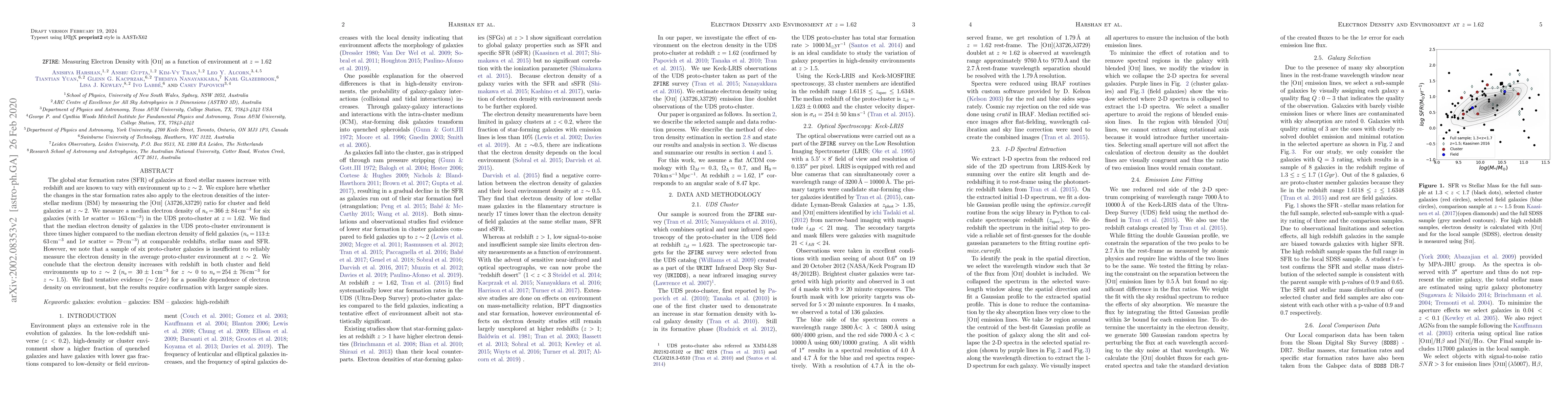 The global star formation rates (SFR) of galaxies at fixed stellar masses increase with redshift and are known to vary with environment unto z~2. We explore here whether the changes in the star formation rates can also apply to the electron densities of the inter-stellar medium (ISM) by measuring the [OII] (3727A/3729A) ratio for cluster and field galaxies at z~2. We measure a median electron density of ne = 366+/-84 cm-3 for six galaxies (with 1-sigma scatter = 163 cm-3) in the UDS proton-cluster at z=1.62. We find that the median electron density of galaxies in the UDS photo-cluster environment is three times higher compared to the median electron density of field galaxies (ne = 113+/- 63 cm-3 and 1-sigma scatter = 79 cm-3) at comparable redshifts, stellar mass and SFR. However, we note that a sample of six photo-cluster galaxies is insufficient to reliably measure the electron density in the average porto-cluster environment at z~2. We conclude that the electron density increases with redshift in both cluster and field environments up to z~2 (ne = 30 +/- 1 cm-3 for z ~ 0 to ne =254+/- 76 cm-3 for z~1.5). We find tentative evidence (~2.6 sigma ) for a possible dependence of electron density on environment, but the results require confirmation with larger sample sizes.
