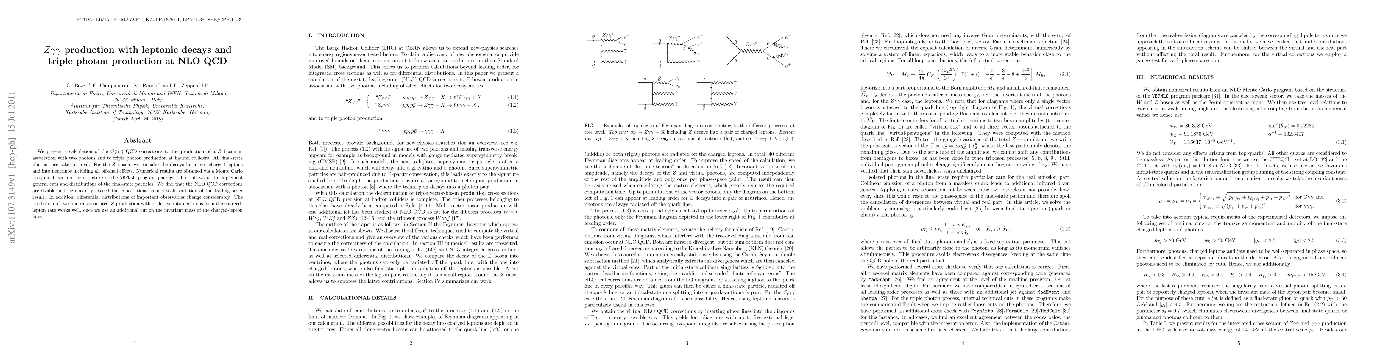 We present a calculation of the O(alpha_s) QCD corrections to the production of a Z boson in association with two photons and to triple photon production at hadron colliders. All final-state photons are taken as real. For the Z boson, we consider the decays both into charged leptons and into neutrinos including all off-shell effects. Numerical results are obtained via a Monte Carlo program based on the structure of the VBFNLO program package. This allows us to implement general cuts and distributions of the final-state particles. We find that the NLO QCD corrections are sizable and significantly exceed the expectations from a scale variation of the leading-order result. In addition, differential distributions of important observables change considerably. The prediction of two-photon-associated Z production with Z decays into neutrinos from the charged-lepton rate works well, once we use an additional cut on the invariant mass of the charged-lepton pair.