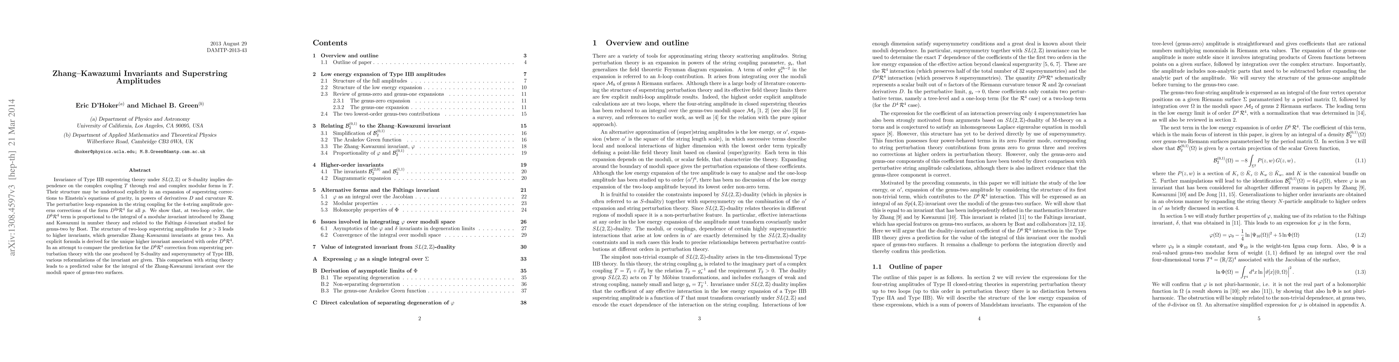 Invariance of Type IIB superstring theory under SL(2,Z) or S-duality implies dependence on the complex coupling T through real and complex modular forms in T. Their structure may be understood explicitly in an expansion of superstring corrections to Einstein's equations of gravity, in powers of derivatives D and curvature R. The perturbative loop expansion in the string coupling for the 4-string amplitude governs corrections of the form D^{2p} R^4 for all p. We show that, at two-loop order, the D^6 R^4 term is proportional to the integral of a modular invariant introduced by Zhang and Kawazumi in number theory and related to the Faltings delta-invariant studied for genus-two by Bost. The structure of two-loop superstring amplitudes for p>3 leads to higher invariants, which generalize Zhang--Kawazumi invariants at genus two. An explicit formula is derived for the unique higher invariant associated with order D^8 R^4. In an attempt to compare the prediction for the D^6 R^4 correction from superstring perturbation theory with the one produced by S-duality and supersymmetry of Type IIB, various reformulations of the invariant are given. This comparison with string theory leads to a predicted value for the integral of the Zhang-Kawazumi invariant over the moduli space of genus-two surfaces.