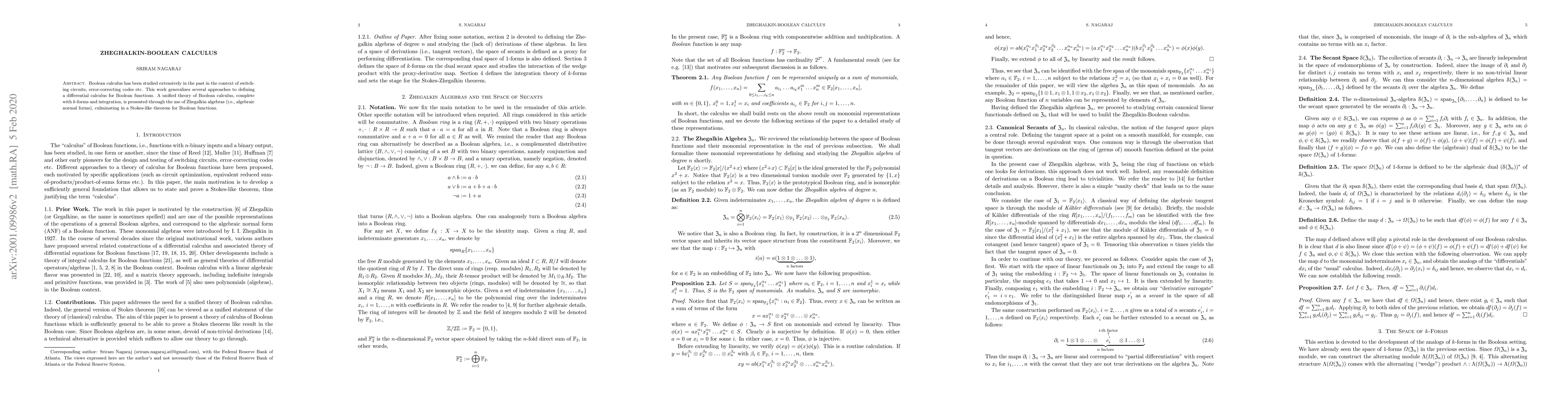Boolean calculus has been studied extensively in the past in the context of switching circuits, error-correcting codes etc. This work generalizes several approaches to defining a differential calculus for Boolean functions. A unified theory of Boolean calculus, complete with k-forms and integration, is presented through the use of Zhegalkin algebras (i.e., algebraic normal forms), culminating in a Stokes-like theorem for Boolean functions.