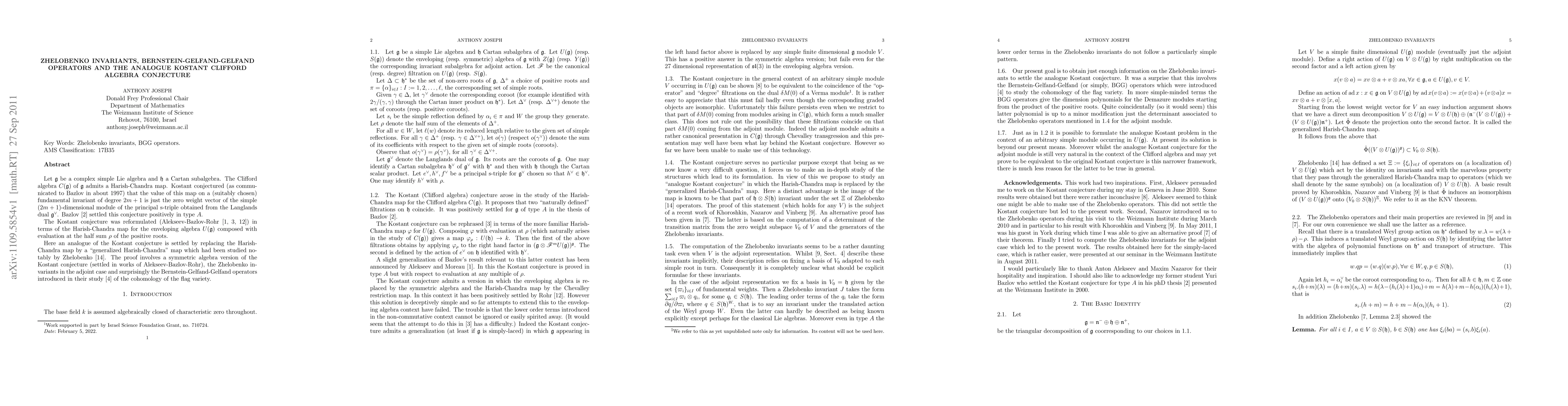 Researchers settle an analogue of Kostant's conjecture using a 'generalized Harish-Chandra' map, involving Zhelobenko invariants and Bernstein-Gelfand-Gelfand operators.