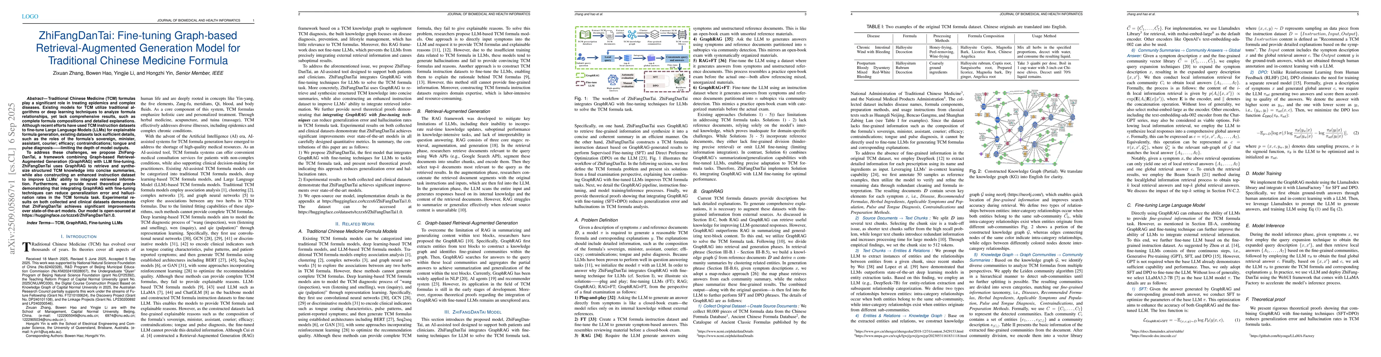 Traditional Chinese Medicine (TCM) formulas play a significant role in treating epidemics and complex diseases. Existing models for TCM utilize traditional algorithms or deep learning techniques to analyze formula relationships, yet lack comprehensive results, such as complete formula compositions and detailed explanations. Although recent efforts have used TCM instruction datasets to fine-tune Large Language Models (LLMs) for explainable formula generation, existing datasets lack sufficient details, such as the roles of the formula's sovereign, minister, assistant, courier; efficacy; contraindications; tongue and pulse diagnosis-limiting the depth of model outputs. To address these challenges, we propose ZhiFangDanTai, a framework combining Graph-based Retrieval-Augmented Generation (GraphRAG) with LLM fine-tuning. ZhiFangDanTai uses GraphRAG to retrieve and synthesize structured TCM knowledge into concise summaries, while also constructing an enhanced instruction dataset to improve LLMs' ability to integrate retrieved information. Furthermore, we provide novel theoretical proofs demonstrating that integrating GraphRAG with fine-tuning techniques can reduce generalization error and hallucination rates in the TCM formula task. Experimental results on both collected and clinical datasets demonstrate that ZhiFangDanTai achieves significant improvements over state-of-the-art models. Our model is open-sourced at https://huggingface.co/tczzx6/ZhiFangDanTai1.0.